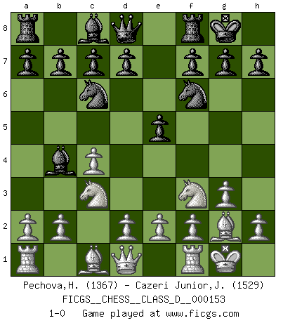 Last move : 1-0 2010 September 15 8:52:58 [Event "FICGS__CHESS__CLASS_D__000153"] [Site "FICGS"] [Date "2010.07.02"] [Round "1"] [White "Pechova,Hana"] [Black "Cazeri Junior,Jose Roque"] [Result "1-0"] [WhiteElo "1367"] [BlackElo "1529"] 1.c4 e5 2.Nc3 Nc6 3.Nf3 Nf6 4.g3 Bb4 5.Bg2 O-O 6.O-O 1-0 This chess game has been lost on time (started : 2010.07.02 11:58:7) English : Four knights, kingside Fianchetto Kingside Castling by player Black (move 5) Kingside Castling by player White (move 6) Player White won this chess game. Follow this game move after move (download)I look one move ahead... the best ! (Siegbert Tarrasch) Sicherlich können nur Meister einen Stil haben. Daß ein nicht-Meister auch nur ein einziges Mal in seinem Leben eine Partie folgerecht durchführte, habe ich niemals bemerkt. (Emanuel Lasker) Bobby Fischer es el mas grande genio de Ajedrez de todos los tiempos. (Alexander Kotov) Les réformistes prétendent que les progrès de la théorie conduiront à la disparition des échecs, et qu'il faut, pour leur rendre vie, en remanier les règles. En réalité, qu'exprime cette affirmation? Le mépris de l'intuition, de l'imagination et de tous les autres éléments qui font des échecs un art. (Alexander Alekhine) Luck is when opportunity knocks and you answer. (Anonymous)