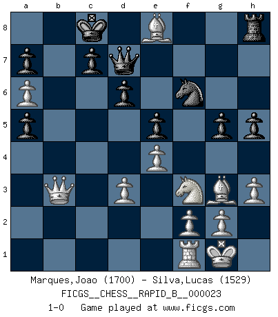 Last move : 1-0 2006 December 29 11:40:15 [Event "FICGS__CHESS__RAPID_B__000023"] [Site "FICGS"] [Date "2006.11.11"] [Round "1"] [White "Marques,Joao"] [Black "Silva,Lucas"] [Result "1-0"] [WhiteElo "1700"] [BlackElo "1529"] 1.e4 e5 2.Nf3 Nc6 3.Bc4 Nf6 4.d3 Bc5 5.O-O d6 6.Bg5 h6 7.Bh4 g5 8.Bg3 Bg4 9.c3 Qd7 10.Nbd2 O-O-O 11.a4 Rdg8 12.b4 Bxb4 13.cxb4 Nxb4 14.Qb3 Nc6 15.a5 h5 16.a6 b6 17.h3 Bxf3 18.Nxf3 Na5 19.Rxa5 bxa5 20.Bxf7 Re8 21.Bxe8 1-0 Two knights defense (Modern Bishop's Opening) Kingside Castling by player White (move 5) Queenside Castling by player Black (move 10) Player White won this chess game. Follow this game move after move (download)Discovered check is the dive bomber of the Chessboard. (Reuben Fine) Ich habe die besten Aussichten, den ersten Preis zu gewinnen - denn jeder muss gegen Steinitz spielen, nur ich nicht! (Wilhelm Steinitz) Bendita sea la memoria de aquel que dio al mundo este juego inmortal. (A. G. Gardiner) Les Cavaliers se révèlent fort utiles dans les positions fermées. D'habitude, les Fous sont un peu plus forts que les Cavaliers dans les positions ouvertes. Qu'on le veuille ou non, il restera toujours des exceptions ! There is a great deal of difference between an eager man who wants to read a book and a tired man who wants a book to read. (G.K. Chesterton)