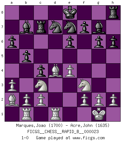 Last move : 1-0 2007 January 3 15:47:59 [Event "FICGS__CHESS__RAPID_B__000023"] [Site "FICGS"] [Date "2006.11.11"] [Round "1"] [White "Marques,Joao"] [Black "Acre,John"] [Result "1-0"] [WhiteElo "1700"] [BlackElo "1635"] 1.e4 g6 2.d4 Bg7 3.Nf3 d6 4.Bc4 a6 5.O-O e6 6.Nc3 Ne7 7.Be3 b5 8.Bb3 Nd7 9.Qd2 c5 10.dxc5 dxc5 11.a3 h6 12.Rab1 Bb7 13.Rfd1 Rc8 14.Qd6 c4 15.Ba2 Qc7 16.Qxc7 Rxc7 17.Bd4 1-0 This chess game has been lost on time (started : 2006.11.11 17:11:25) Robatsch (Modern) defense Kingside Castling by player White (move 5) Player White won this chess game. Follow this game move after move (download)The battle for the ultimate truth will never be won. And that's why Chess is so fascinating. (Hans Kmoch) Die starken Figuren des Gegners muss man abtauschen. (José Raúl Capablanca) El Ajedrez, como la música, como el amor, tiene el poder de hacer feliz a la gente. (Siegbert Tarrasch) Un millionnaire : 'Monsieur Steinitz ! Vous ne participez aux tournois que pour l'argent, alors que moi je n'y viens que pour l'honneur.' Steinitz : 'Chacun joue pour ce qu'il n'a pas'... It is a good thing for an uneducated man to read books of quotations. (Winston Churchill)