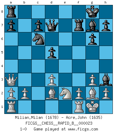 Last move : 1-0 2007 January 2 21:40:56 [Event "FICGS__CHESS__RAPID_B__000023"] [Site "FICGS"] [Date "2006.11.11"] [Round "1"] [White "Milian,Milan"] [Black "Acre,John"] [Result "1-0"] [WhiteElo "1678"] [BlackElo "1635"] 1.c4 f5 2.Nc3 Nf6 3.g3 g6 4.Bg2 Bg7 5.e4 fxe4 6.Nxe4 Nxe4 7.Bxe4 O-O 8.Ne2 e6 9.O-O d5 10.cxd5 exd5 11.Bg2 Bf5 12.Qb3 Nc6 13.Qxb7 Qd7 14.Qb3 Be6 15.Qa3 Rf7 16.d3 Bh3 17.Bd2 1-0 This chess game has been lost on time (started : 2006.11.11 17:11:25) English : Anglo-Dutch defense Kingside Castling by player Black (move 7) Kingside Castling by player White (move 9) Player White won this chess game. Follow this game move after move (download)The hardest game to win is a won game. (Emanuel Lasker) Mein Gehirn das ist mein zweitwichtigstes Organ [Aus dem Film: Der Schläfer]. (Woody Allen) Las piezas de Ajedrez son los bloques del alfabeto que moldean los pensamientos; y esos pensamientos, aunque hagan un diseño visual en el tablero, expresan abstractamente su belleza como un poema. (Marcel Duchamp) Aux échecs, l'amour-propre est satisfait quand on remporte la victoire, mais il n'y a pas de honte à être battu. (Benjamin Franklin) Tree pose grows confidence. It roots me to this world. (Terri Guillemets)