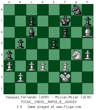 Last move : 1-0 2007 March 29 9:14:21 [Event "FICGS__CHESS__RAPID_B__000023"] [Site "FICGS"] [Date "2006.11.11"] [Round "1"] [White "Vasquez,Fernando"] [Black "Milian,Milan"] [Result "1-0"] [WhiteElo "1695"] [BlackElo "1678"] 1.e4 e5 2.Nf3 Nf6 3.Nc3 Bb4 4.Nxe5 Bxc3 5.dxc3 d6 6.Nf3 Nxe4 7.Bd3 Nc5 8.O-O Nxd3 9.Qxd3 O-O 10.Ng5 g6 11.Ne4 f6 12.Bh6 Rf7 13.Qd5 Nc6 14.Rfe1 Bf5 15.Ng3 Bd7 16.Rab1 a5 17.a3 a4 18.Qe4 Ra5 19.Qc4 Ne5 20.Qd4 g5 21.f3 Bc6 22.Qd2 b6 23.Re2 Rd5 24.Qe3 Qc8 25.Qf2 Qd7 26.Nf1 Ng6 27.Rbe1 Re5 28.Rxe5 dxe5 29.Ne3 Qe6 30.Rd1 Rd7 31.Rxd7 Qxd7 32.Qe2 Kf7 33.g3 Qe6 34.Qf1 b5 35.Kf2 Qd7 36.Qd3 Qxd3 37.cxd3 Ne7 38.h4 gxh4 39.gxh4 Ng8 40.Ng4 1-0 This chess game has been lost on time (started : 2006.11.11 17:11:25) Petrov Three knights game Kingside Castling by player White (move 8) Kingside Castling by player Black (move 9) Player White won this chess game. Follow this game move after move (download)The isolated Pawn casts gloom over the entire chessboard. (Aaron Nimzovich) Spielt Blackmar-Diemer-Gambit, und das Matt kommt von selbst! (Emil Joseph Diemer) Fischer era un maestro de claridad y un Rey del posicionamiento astuto. Sus oponentes podían ver hacia donde se dirigía pero eran impotentes para detenerlo. (Bruce Pandolfini) Le plus grand jeu de l'esprit jamais inventé, plus vous l'apprenez, plus vous y prenez du plaisir. (Garry Kasparov) Fame, I have already. Now I need the money. (an elderly Steinitz)