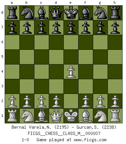 Last move : 1-0 2006 December 22 19:46:52 [Event "FICGS__CHESS__CLASS_M__000007"] [Site "FICGS"] [Date "2006.11.12"] [Round "1"] [White "Bernal Varela,Nelson"] [Black "Gurcan,Selim"] [Result "1-0"] [WhiteElo "2195"] [BlackElo "2238"] 1.e4 1-0 This chess game has been lost on time (started : 2006.11.12 17:50:40) King's pawn Opening Player White won this chess game. Follow this game move after move (download)The combination player thinks forward; he starts from the given position, and tries the forceful moves in his mind. (Emanuel Lasker) Verschiedene, sehr schätzbare und im Laufe des Lebens nützliche Eigenschaften des Geistes können durch das Schachspiel erworben und gekräftigt werden, so dass sie zu Gewohnheiten werden, die uns nie im Stich lassen. (Benjamin Franklin) Cuando tu no sabes absolutamente que mas hacer, es tiempo de entrar en pánico. (John van der Wiel) Les échecs sont utiles à l'exercice de la faculté de penser et à celle de l'imagination. Car nous devons posséder une méthode élaborée pour atteindre des buts partout où nous devons conduire notre raison. (Leibnitz) Hold em is to stud what chess is to checkers. (Johnny Moss)