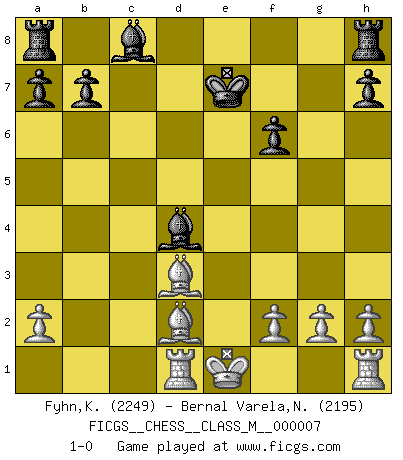 Last move : 1-0 2007 March 19 7:26:17 [Event "FICGS__CHESS__CLASS_M__000007"] [Site "FICGS"] [Date "2006.11.12"] [Round "1"] [White "Fyhn,Karsten"] [Black "Bernal Varela,Nelson"] [Result "1-0"] [WhiteElo "2249"] [BlackElo "2195"] 1.e4 c5 2.c3 d5 3.exd5 Qxd5 4.d4 Nf6 5.Nf3 e6 6.Na3 Nc6 7.Nb5 Qd8 8.dxc5 Bxc5 9.Qxd8+ Kxd8 10.Bf4 Ne4 11.Rd1+ Ke7 12.Nbd4 Nxd4 13.Nxd4 g5 14.Bc1 e5 15.Bd3 Nxc3 16.bxc3 exd4 17.cxd4 Bxd4 18.Bxg5+ f6 19.Bd2 1-0 This chess game has been lost on time (started : 2006.11.12 17:50:40) Sicilian : Alapin's variation (2.c3) Player White won this chess game. Follow this game move after move (download)Good offense and good defense both begin with good development. (Bruce A. Moon) Schach ist ein Kampf gegen den Fehler. (Johannes Herrman Zukertort) Un juego de Ajedrez es un dialogo, una conversación entre un jugador y su oponente. Cada movimiento del oponente puede contener amenazas o tropiezos, pero un jugador no se puede defender de las amenazas o tomar ventaja de los tropiezos si es que no se pregunta a sí mismo: ¿Que es lo que mi oponente va a hacer después de cada movida?. (Bruce A. Moon) Avant la finale, les dieux ont créé le milieu de partie. (Tarrasch) Luck is when opportunity knocks and you answer. (Anonymous)