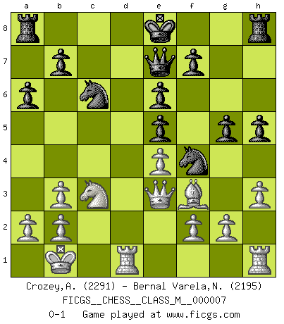 Last move : 0-1 2007 March 23 1:54:5 [Event "FICGS__CHESS__CLASS_M__000007"] [Site "FICGS"] [Date "2006.11.12"] [Round "1"] [White "Crozey,Antoine"] [Black "Bernal Varela,Nelson"] [Result "0-1"] [WhiteElo "2291"] [BlackElo "2195"] 1.e4 c5 2.Nf3 d6 3.d4 cxd4 4.Nxd4 Nf6 5.Nc3 a6 6.Be3 Ng4 7.Bg5 h6 8.Bh4 g5 9.Bg3 Bg7 10.h3 Ne5 11.Be2 Nbc6 12.Nb3 Ng6 13.Qd2 Be6 14.O-O-O Bxb3 15.cxb3 Be5 16.Kb1 e6 17.Bxe5 dxe5 18.Qe3 Qe7 19.Bh5 Nf4 20.Bf3 h5 0-1 Sicilian : Najdorf, Byrne (English) attack Queenside Castling by player White (move 14) Player Black won this chess game. Follow this game move after move (download)There is only one thing Fischer does in Chess without pleasure: to lose ! (Boris Spassky) Gewinnen beim Schach fördert das Selbstvertrauen. Beim Sex spüre ich sowas nicht... (Garry Kasparov) El Ajedrez, como cualquier otra actividad creativa, puede existir solo a través de méritos combinados de aquellos que tienen talento creativo y de aquellos que tienen la habilidad de organizar un trabajo creativo. (Mikhail Botvinnik) Votre seul travail dans les ouvertures est d'obtenir un milieu de partie jouable. (Lajos Portish) Experience is the name we all give to our mistakes. (Oscar Wilde)