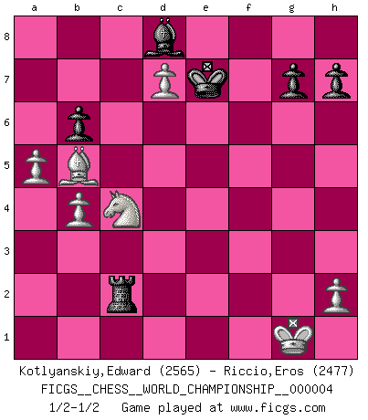 Last move : 1/2-1/2 2011 January 12 19:11:57 [Event "FICGS__CHESS__WORLD_CHAMPIONSHIP__000004"] [Site "FICGS"] [Date "2010.07.03"] [Round "1"] [White "Kotlyanskiy,Edward"] [Black "Riccio,Eros"] [Result "1/2-1/2"] [WhiteElo "2565"] [BlackElo "2477"] 1.e4 c5 2.Nf3 d6 3.d4 cxd4 4.Nxd4 Nf6 5.Nc3 a6 6.f3 e5 7.Nb3 Be6 8.Be3 Be7 9.Be2 O-O 10.O-O Nbd7 11.Nd5 Nxd5 12.exd5 Bf5 13.Qd2 Qc7 14.Rac1 a5 15.a4 Bg6 16.Bb5 f5 17.Nxa5 f4 18.Bf2 e4 19.fxe4 f3 20.Nc4 fxg2 21.Rfe1 Nc5 22.e5 Ne4 23.Rxe4 Bxe4 24.Re1 Rxf2 25.Qxf2 Rf8 26.Qd2 Qc5+ 27.Qe3 Qxe3+ 28.Nxe3 Bh4 29.Re2 Bf3 30.Rd2 Be1 31.Rxg2 Bxg2 32.Kxg2 dxe5 33.d6 Rf2+ 34.Kg1 Rd2 35.Nc4 Rxc2 36.d7 Bh4 37.Nd6 b6 38.b4 e4 39.Nxe4 Bd8 40.Nd6 Kf8 41.Nc4 Ke7 42.a5 1/2-1/2 Thibault de Vassal Congrats Eros for winning these 4th and 5th WCH cycle at once :) .. and congrats to Edward for a nice score at the end. I hope we'll see you playing other spectacular games to try to regain the title! Thank you guys for the show... Sicilian : Najdorf Kingside Castling by player Black (move 9) Kingside Castling by player White (move 10) This chess game ended in a draw. Follow this game move after move (download)You sit at the board and suddenly your heart leaps. Your hand trembles to pick up the piece and move it. But what Chess teaches you is that you must sit there calmly and think about whether it's really a good idea and whether there are other better ideas. (Stanley Kubrick) Die Fehler sind da, Sie warten nur darauf gemacht zu werden. (Savielly Grigorievitsch Tartakower) No puedes jugar al Ajedrez si eres de corazón noble. (Proverbio Francés) Je ne suis pas le dernier à jouer lâchement des coups douteux pendant le zeïtnot de l'adversaire pour l'achever: en effet les coups qui font le plus peur sont ceux que l'on ne comprend pas. Je me fais souvent peur quand je joue. (Un professeur anonyme) As a goal marker shodan is important. As a destination it is a poor place to stop. (Thomas Tamayo)