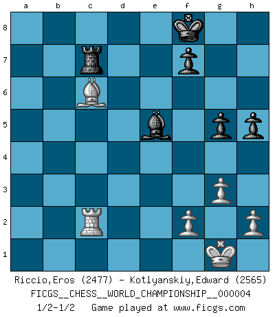 Last move : 1/2-1/2 2011 January 2 18:53:25 [Event "FICGS__CHESS__WORLD_CHAMPIONSHIP__000004"] [Site "FICGS"] [Date "2010.07.03"] [Round "2"] [White "Riccio,Eros"] [Black "Kotlyanskiy,Edward"] [Result "1/2-1/2"] [WhiteElo "2477"] [BlackElo "2565"] 1.d4 d5 2.Nf3 Nf6 3.c4 c6 4.Nc3 e6 5.Bg5 h6 6.Bh4 dxc4 7.e4 g5 8.Bg3 b5 9.Be2 Bb7 10.O-O Nbd7 11.Ne5 h5 12.Nxd7 Qxd7 13.Qc1 Rg8 14.Rd1 Bb4 15.Be5 Qe7 16.a4 a6 17.d5 exd5 18.Bxf6 Qxf6 19.axb5 Bxc3 20.bxa6 Bxb2 21.axb7 Rb8 22.Ra8 Ke7 23.Qd2 c3 24.Qe3 d4 25.Rxd4 c2 26.e5 Qg6 27.Rxb8 Rxb8 28.Rc4 Rxb7 29.Qc5+ Ke8 30.Bf3 Re7 31.Qxc6+ Qxc6 32.Bxc6+ Kf8 33.Rxc2 Bxe5 34.g3 Rc7 1/2-1/2 Queen's pawn game Kingside Castling by player White (move 10) This chess game ended in a draw. Follow this game move after move (download)The hardest game to win is a won game. (Emanuel Lasker) Ich moechte nie einem Club beitreten, der Leute wie mich als Mitglieder aufnimmt. (Woody Allen) No nos podemos resistir a la fascinación de un sacrificio ya que la pasión por los sacrificios es parte de la naturaleza de un jugador de Ajedrez. (Rudolf Spielman) Aux échecs, l'amour-propre est satisfait quand on remporte la victoire, mais il n'y a pas de honte à être battu. (Benjamin Franklin) You think that education is too expensive ? Try ignorance. (Derek Bok)