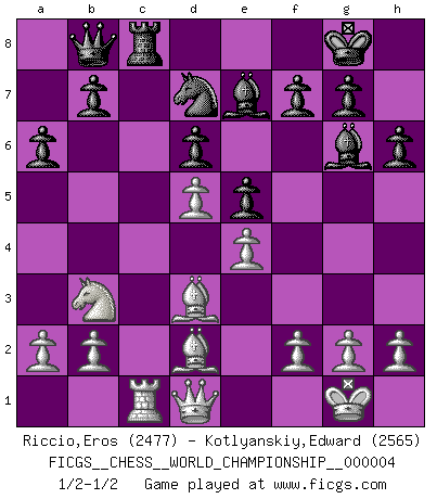 Last move : 1/2-1/2 2010 November 26 5:57:22 [Event "FICGS__CHESS__WORLD_CHAMPIONSHIP__000004"] [Site "FICGS"] [Date "2010.07.03"] [Round "8"] [White "Riccio,Eros"] [Black "Kotlyanskiy,Edward"] [Result "1/2-1/2"] [WhiteElo "2477"] [BlackElo "2565"] 1.e4 c5 2.Nf3 d6 3.d4 cxd4 4.Nxd4 Nf6 5.Nc3 a6 6.Bg5 e6 7.Qf3 h6 8.Be3 e5 9.Nb3 Be6 10.Nd5 Nbd7 11.c4 Bg4 12.Qg3 Nxd5 13.cxd5 Bh5 14.Bd3 Bg6 15.Bd2 Be7 16.O-O O-O 17.Rac1 Rc8 18.Qf3 Rxc1 19.Rxc1 Qb8 20.Qd1 Rc8 1/2-1/2 Sicilian : Najdorf, 6...e6 Kingside Castling by player White (move 16) Kingside Castling by player Black (move 16) This chess game ended in a draw. Follow this game move after move (download)After a bad opening, there is hope for the middle game. After a bad middle game, there is hope for the endgame. But once you are in the endgame, the moment of truth has arrived. (Edmar Mednis) Gewinnen beim Schach fördert das Selbstvertrauen. Beim Sex spüre ich sowas nicht... (Garry Kasparov) Aquel que ve no otra dirección en el juego que la de dar Jaque Mate a su oponente, nunca será un buen jugador de Ajedrez. (Euwe) La conception d'un plan est le processus par lequel un joueur exploite les avantages de sa position tout en s'efforçant d'en réduire au minimum les inconvénients. Afin de garantir le succès, un plan doit toujours se fonder sur un diagnostic objectif des particularités d'une position. La conception d'un plan est d'autant plus difficile que la position est équilibrée, et grandement facilitée lorsqu'il n'existe qu'un seul plan susceptible de répondre aux exigences de la position. (Harry Golombek) Imagination is more important than knowledge. Knowledge is limited. Imagination encircles the world. (Albert Einstein)