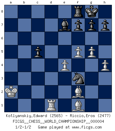 Last move : 1/2-1/2 2010 August 26 16:50:8 [Event "FICGS__CHESS__WORLD_CHAMPIONSHIP__000004"] [Site "FICGS"] [Date "2010.07.03"] [Round "9"] [White "Kotlyanskiy,Edward"] [Black "Riccio,Eros"] [Result "1/2-1/2"] [WhiteElo "2565"] [BlackElo "2477"] 1.e4 c5 2.Nf3 d6 3.d4 cxd4 4.Nxd4 Nf6 5.Nc3 a6 6.Be3 e5 7.Nb3 Be6 8.Qd2 Be7 9.f3 O-O 10.O-O-O Nbd7 11.g4 b5 12.g5 b4 13.Ne2 Ne8 14.f4 a5 15.f5 a4 16.Nbd4 exd4 17.Nxd4 b3 18.Kb1 bxc2+ 19.Nxc2 Bb3 20.axb3 axb3 21.Na3 Ne5 22.h4 Ra4 23.Rh3 Qa8 24.Qd5 Rxa3 25.bxa3 Qxa3 26.Qd2 Nf6 27.Bd4 Nfd7 28.Rc3 Nc5 29.Rxc5 Nf3 30.Qa5 Qa2+ 31.Qxa2 bxa2+ 32.Kxa2 dxc5 33.Bf2 1/2-1/2 Sicilian : Najdorf, Byrne (English) attack Kingside Castling by player Black (move 9) Queenside Castling by player White (move 10) This chess game ended in a draw. Follow this game move after move (download)Different people feel differently about resigning. (Bobby Fischer) Wie, soll nun auch die Opposition abgeschafft werden? Ja, es tut mir leid, Ihnen diesen Schmerz nicht ersparen zu können. (Aaron Nimzowitsch) Me siento como si fuera una pieza en una partida de Ajedrez, cuando mi oponente me indica: esa pieza no puede ser movida. (Soren Kierkegaard) La solitude du joueur d'Echecs à l'approche du mat est semblable à celle du condamné. (Francis Szpiner) Who needs drugs and alcohol if he can play Big Chess at FICGS ? (Heinz-Georg Lehnhoff)