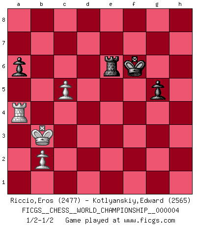 Last move : 1/2-1/2 2011 January 12 18:42:58 [Event "FICGS__CHESS__WORLD_CHAMPIONSHIP__000004"] [Site "FICGS"] [Date "2010.07.03"] [Round "10"] [White "Riccio,Eros"] [Black "Kotlyanskiy,Edward"] [Result "1/2-1/2"] [WhiteElo "2477"] [BlackElo "2565"] 1.e4 c5 2.Nf3 d6 3.d4 cxd4 4.Nxd4 Nf6 5.Nc3 a6 6.Be3 e5 7.Nb3 Be6 8.Qd2 Be7 9.f3 O-O 10.O-O-O Nbd7 11.g4 b5 12.a3 Nb6 13.g5 Nh5 14.Na5 Rc8 15.Kb1 g6 16.h4 Ng3 17.Rh2 Nxf1 18.Rxf1 Na4 19.Nxa4 bxa4 20.Rd1 Qc7 21.h5 d5 22.exd5 Bxd5 23.hxg6 Bxf3 24.gxh7+ Kh8 25.Rc1 Rb8 26.c4 Bxa3 27.Qe1 Be4+ 28.Ka2 Bb4 29.Qf2 Be7 30.Bd2 Bg6 31.Qg3 Rfe8 32.Re1 Bf8 33.Bc3 Bg7 34.Rhe2 Re6 35.Rxe5 Bc2 36.g6 Bxg6 37.R1e3 Rxe5 38.Rxe5 Rf8 39.Qe1 Qd7 40.Rd5 Qh3 41.Bxg7+ Kxg7 42.Qd1 Rb8 43.Nc6 Qb3+ 44.Qxb3 Rxb3 45.h8Q+ Kxh8 46.Ra5 Rb6 47.Ne5 Re6 48.Nxg6+ fxg6 49.Rxa4 Kg7 50.Kb3 g5 51.c5 Kf6 1/2-1/2 Sicilian : Najdorf, Byrne (English) attack Kingside Castling by player Black (move 9) Queenside Castling by player White (move 10) Promotion Queen by player White (move 45) 10 pieces endgame at move 48 : White KRNPP , Black KRPPP WHITE : King + 1 Rook 1 Knight 2 Pawns BLACK : King + 1 Rook 3 Pawns 9 pieces endgame at move 48 : White KRPP , Black KRPPP WHITE : King + 1 Rook 2 Pawns BLACK : King + 1 Rook 3 Pawns 8 pieces endgame at move 49 : White KRPP , Black KRPP WHITE : King + 1 Rook 2 Pawns BLACK : King + 1 Rook 2 Pawns This chess game ended in a draw. Follow this game move after move (download)Many have become Chess Masters, no one has become the Master of Chess. (Siegbert Tarrasch) Stelle das Brett so, daß die Sonne in die Augen deines Gegners scheint. (Ruy López) Bendita sea la memoria de aquel que dio al mundo este juego inmortal. (A. G. Gardiner) Aux échecs, les retours au sommet sont rares : les dommages psychologiques consécutifs à une défaite sont trop sévères. (Daily Telegraph) The problem with troubleshooting is that trouble shoots back. (Anonymous)