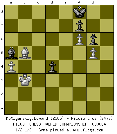 Last move : 1/2-1/2 2010 November 26 6:3:32 [Event "FICGS__CHESS__WORLD_CHAMPIONSHIP__000004"] [Site "FICGS"] [Date "2010.07.03"] [Round "11"] [White "Kotlyanskiy,Edward"] [Black "Riccio,Eros"] [Result "1/2-1/2"] [WhiteElo "2565"] [BlackElo "2477"] 1.e4 c5 2.Nf3 d6 3.d4 cxd4 4.Nxd4 Nf6 5.Nc3 a6 6.Be3 e5 7.Nb3 Be6 8.f3 Be7 9.Qd2 O-O 10.O-O-O Nbd7 11.g4 b5 12.g5 b4 13.Ne2 Ne8 14.f4 a5 15.f5 a4 16.Nbd4 exd4 17.Nxd4 b3 18.Kb1 bxc2+ 19.Nxc2 Bb3 20.axb3 axb3 21.Na3 Ne5 22.Qg2 Qb8 23.Bf4 Ra4 24.f6 Bd8 25.Bxe5 dxe5 26.Bb5 Rxa3 27.bxa3 Nd6 28.Ba6 Qb6 29.Qe2 Bc7 30.Rd2 Qa5 31.Rc1 Nxe4 32.Rd7 Nc3+ 33.Rxc3 Qxc3 34.Bc4 Bb6 35.Qe4 Rd8 36.Bd3 g6 37.Rxd8+ Bxd8 38.Qd5 Qd4 39.Qxd4 exd4 40.a4 h6 41.h4 hxg5 42.hxg5 Kf8 43.Kb2 Bc7 44.Bb5 Ba5 45.Kxb3 1/2-1/2 Sicilian : Najdorf, Byrne (English) attack Kingside Castling by player Black (move 9) Queenside Castling by player White (move 10) 10 pieces endgame at move 45 : White KBPPP , Black KBPPP WHITE : King + 1 Bishop 3 Pawns BLACK : King + 1 Bishop 3 Pawns This chess game ended in a draw. Follow this game move after move (download)An attack on the wing should be met by play in the center. (Nimzovitch) Frage: Wie viele Autos haben Sie schon zerstört? - Antwort: Nur zwei. (Loek van Wely) Un entendimiento minucioso de las típicas continuaciones de mate hacen de las mas complicadas combinaciones de sacrificio que conducen hacia ellas no solo no dificiles, sino casi un asunto de rutina. (Siegbert Tarrasch) Les Echecs sont affaire de jugement sensible. Savoir quand frapper et quand esquiver. (Fischer) My poor ole parrot... Is not in the circulation of displays ....poo hoo hoo :) (Wayne Lowrance's enigma)