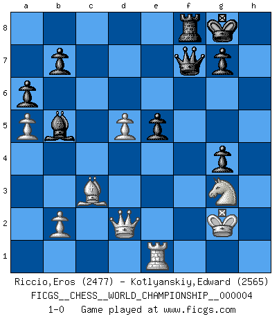 Last move : 1-0 2011 January 12 11:0:50 [Event "FICGS__CHESS__WORLD_CHAMPIONSHIP__000004"] [Site "FICGS"] [Date "2010.07.03"] [Round "12"] [White "Riccio,Eros"] [Black "Kotlyanskiy,Edward"] [Result "1-0"] [WhiteElo "2477"] [BlackElo "2565"] 1.e4 c5 2.Nf3 d6 3.d4 cxd4 4.Nxd4 Nf6 5.Nc3 a6 6.h3 e5 7.Nde2 h5 8.g3 Be6 9.Bg2 Nbd7 10.O-O Be7 11.Be3 Rc8 12.a4 O-O 13.a5 Re8 14.Qd2 Rc7 15.f4 Bc4 16.Rfd1 Qc8 17.f5 d5 18.exd5 Bd6 19.Re1 Nc5 20.g4 hxg4 21.hxg4 Nxg4 22.Ng3 Bb5 23.Bg5 Na4 24.Nce4 Bc5+ 25.Nxc5 Rxc5 26.Ne4 Rxc2 27.Qd1 Rxg2+ 28.Kxg2 Qxf5 29.Rxa4 f6 30.Bd2 Qh5 31.Rh1 Qg6 32.Ng3 f5 33.Rxg4 fxg4 34.Re1 Qf7 35.Bc3 Rf8 36.Qd2 1-0 This chess game has been lost on time (started : 2010.07.03 0:57:53) Sicilian : Najdorf, Adams attack Kingside Castling by player White (move 10) Kingside Castling by player Black (move 12) Player White won this chess game. Follow this game move after move (download)Fischer is completely natural. He plays no roles. He's like a child. Very, very simple. (Zita Rajcsanyi) Man braucht nicht immer den besten Zug zu spielen: Ein Zug muß aktiv, unternehmungslustig, korrekt und schön sein. (David Bronstein) Ciertamente el estado mental actual de Bobby Fischer es una tragedia. Uno de los mas grandes jugadores de Ajedrez del mundo -el orgullo y pena del Ajedrez Americano. (Frank Brady) La tactique, c'est ce que vous faites quand il y a quelque chose à faire; la stratégie, c'est ce que vous faites quand il n'y a rien à faire. (Savielli Tartacower) Wisdom doesn't necessarily come with age. Sometimes age just shows up all by itself. (Tom Watson)