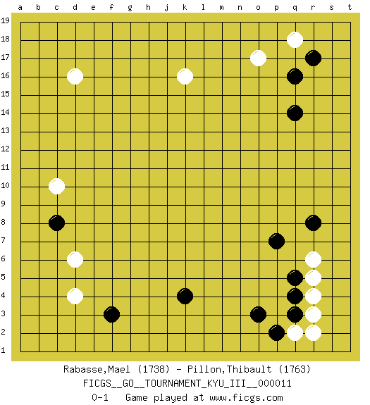 Last move : 0-1 2010 August 22 22:44:58 [Event "FICGS__GO__TOURNAMENT_KYU_III__000011 "] [Site "FICGS"] [Date "2010.07.04"] [Round "1"] [Black "Rabasse,Mael "] [White "Pillon,Thibault "] [Result "0-1"] [Rating 1 "1738"] [Rating 2 "1763"] 1.q16 d4 2.q4 d16 3.f3 d6 4.k4 r6 5.r8 r3 6.q3 r4 7.q5 r5 8.p7 q2 9.p2 r2 10.o3 o17 11.q14 q18 12.r17 k16 13.c8 c10 0-1 This go game has been lost on time (started : 2010.07.04 11:49:1) Here are the names of the openings (joseki) played in the four corners : Corner d4 : d4 f3Hoshi (Hwajeom, Seongjeom, Xingwei`) 4-4 Point. The star or hoshi (4-4) point, emphasizing influence at the potential expense of territory.Ikken Kakari (Hankan Keolch'im, Yi Gua`jiao~, 1-Space Low Approach). Black 2 is the standard approach move to the 4-4. Corner q4 : q4 r6Hoshi (Hwajeom, Seongjeom, Xingwei`) 4-4 Point. The star or hoshi (4-4) point, emphasizing influence at the potential expense of territory.Ikken Kakari (Hankan Keolch'im, Yi Gua`jiao~, 1-Space Low Approach). White 2 is the standard approach move to the 4-4. Corner q16 : q16 o17Hoshi (Hwajeom, Seongjeom, Xingwei`) 4-4 Point. The star or hoshi (4-4) point, emphasizing influence at the potential expense of territory.Ikken Kakari (Hankan Keolch'im, Yi Gua`jiao~, 1-Space Low Approach). White 2 is the standard approach move to the 4-4. Player White won this Go (weiqi, baduk) game.Follow this game move after move (download ) Keep sente in the opening. A premature attack loses sente. (Anonymous) For a mechanic, you seem to do an excessive amount of thinking. (C-3PO in Star Wars ep.2)