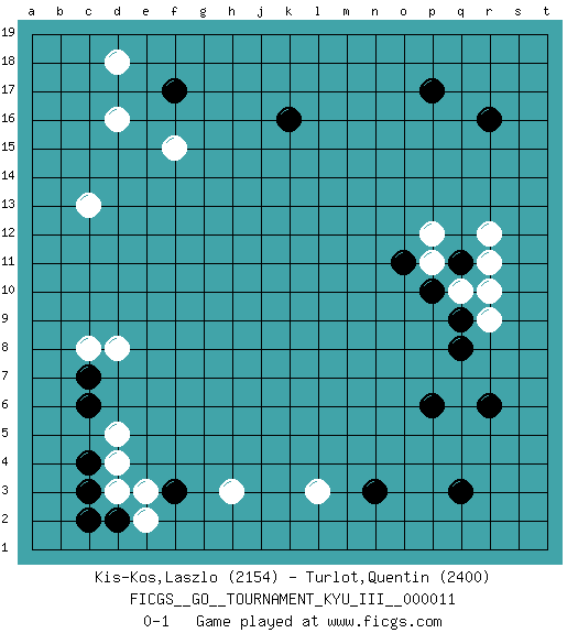 Last move : 0-1 2010 September 8 23:27:13 [Event "FICGS__GO__TOURNAMENT_KYU_III__000011"] [Site "FICGS"] [Date "2010.07.04"] [Round "1"] [Black "Kis-Kos,Laszlo"] [White "Turlot,Quentin"] [Result "0-1"] [Rating 1 "2154"] [Rating 2 "2400"] 1.r16 d4 2.q3 d16 3.p17 r9 4.r6 r12 5.f3 h3 6.c3 d3 7.c4 d5 8.d2 e2 9.c2 e3 10.c6 l3 11.n3 c13 12.f17 d18 13.k16 c8 14.c7 d8 15.p6 f15 16.q11 r11 17.q9 q10 18.p10 r10 19.q8 p11 20.o11 p12 0-1 This go game has been lost on time (started : 2010.07.04 11:49:1) Here are the names of the openings (joseki) played in the four corners : Corner q4 : q3 r9 Komoku (Somok, Xiao~mu`) 3-4 Point. The komoku (3-4) point is the traditional corner enclosure move.. Corner d4 : d4 f3 Hoshi (Hwajeom, Seongjeom, Xingwei`) 4-4 Point. The star or hoshi (4-4) point, emphasizing influence at the potential expense of territory. Ikken Kakari (Hankan Keolch'im, Yi Gua`jiao~, 1-Space Low Approach). Black 2 is the standard approach move to the 4-4. Player White won this Go (weiqi, baduk) game. Follow this game move after move (download)Capture what you cut off. (Anonymous) The hypothalamus is one of the most important parts of the brain, involved in many kinds of motivation, among other functions. The hypothalamus controls the 'Four Fs: Fighting, Fleeing, Feeding and Mating. (Unknown author)