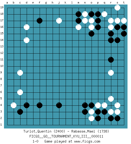 Last move : 1-0 2010 September 3 11:5:41 [Event "FICGS__GO__TOURNAMENT_KYU_III__000011 "] [Site "FICGS"] [Date "2010.07.04"] [Round "1"] [Black "Turlot,Quentin "] [White "Rabasse,Mael "] [Result "1-0"] [Rating 1 "2400"] [Rating 2 "1738"] 1.d4 d16 2.r4 r17 3.r11 p4 4.n3 r3 5.q3 q4 6.p3 o3 7.o4 o2 8.r2 s3 9.p2 r5 10.s2 s4 11.n4 r9 12.r14 c6 13.f4 b4 14.c3 c9 15.j4 o16 16.f17 d14 17.m17 j17 18.p17 o17 19.o18 n18 20.p18 n17 21.p16 m16 22.s16 r16 23.r15 s17 24.o15 s15 25.t16 s19 26.s14 t17 27.t15 q18 28.m18 1-0 This go game has been lost on time (started : 2010.07.04 11:49:1) Here are the names of the openings (joseki) played in the four corners : Corner q16 : r17 r11San-San (Sam-Sam, San-San) 3-3 Point. The San-San (3-3) point, emphasizing territory at the expense of influence. Corner q4 : r4 p4Komoku (Somok, Xiao~mu`) 3-4 Point. The komoku (3-4) point is the traditional corner enclosure move..Ikken Takagakari (Hankan Nop'dakeolch'im, Yi Gaogua`jiao~, 1-Space High Approach). The 5-4 approach move has become more popular in modern times, as modern Go emphasizes speed and influence. Corner d4 : d4 c6Hoshi (Hwajeom, Seongjeom, Xingwei`) 4-4 Point. The star or hoshi (4-4) point, emphasizing influence at the potential expense of territory.Ikken Kakari (Hankan Keolch'im, Yi Gua`jiao~, 1-Space Low Approach). White 2 is the standard approach move to the 4-4. Corner d16 : d16 f17Hoshi (Hwajeom, Seongjeom, Xingwei`) 4-4 Point. The star or hoshi (4-4) point, emphasizing influence at the potential expense of territory.Ikken Kakari (Hankan Keolch'im, Yi Gua`jiao~, 1-Space Low Approach). Black 2 is the standard approach move to the 4-4. Player Black won this Go (weiqi, baduk) game.Follow this game move after move (download ) Knight's moves win running battles. (Anonymous) CHESS, n. f. [echecs, Fr.] A nice and abstruse game, in which two sets of puppets are moved in opposition to each other. (Dr Samuel Johnson, A Dictionary Of The English Language, 1755)
