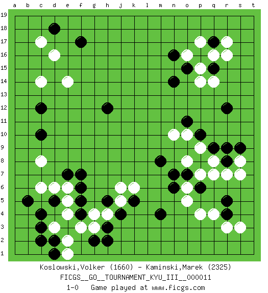 Last move : 1-0 2010 December 6 10:29:7 [Event "FICGS__GO__TOURNAMENT_KYU_III__000011 "] [Site "FICGS"] [Date "2010.07.04"] [Round "1"] [Black "Koslowski,Volker "] [White "Kaminski,Marek "] [Result "1-0"] [Rating 1 "1660"] [Rating 2 "2325"] 1.r4 d3 2.q17 d16 3.d5 p4 4.f4 r3 5.m4 q4 6.r5 s3 7.p6 o6 8.o7 o5 9.n6 p7 10.p8 q7 11.f17 c14 12.d18 q14 13.r12 q16 14.p16 r17 15.q15 r16 16.h12 p15 17.o15 p14 18.n14 o16 19.n16 p17 20.c10 c17 21.m8 q8 22.q9 o8 23.n7 p9 24.p10 o10 25.r9 s8 26.r8 r7 27.s9 s7 28.o11 n10 29.c4 f3 30.h3 e4 31.c3 g4 32.f5 g3 33.h2 h4 34.j4 j5 35.k5 e5 36.f7 e6 37.f6 d6 38.e7 c6 39.d2 e2 40.d1 j6 41.c12 e14 42.g2 e1 43.c2 c8 44.b5 k6 45.h5 1-0 This go game has been lost on time (started : 2010.07.04 11:49:1) Here are the names of the openings (joseki) played in the four corners : Corner d4 : d3 d5Komoku (Somok, Xiao~mu`) 3-4 Point. The komoku (3-4) point is the traditional corner enclosure move..Ikken Takagakari (Hankan Nop'dakeolch'im, Yi Gaogua`jiao~, 1-Space High Approach). The 5-4 approach move has become more popular in modern times, as modern Go emphasizes speed and influence. Corner q4 : r4 p4Komoku (Somok, Xiao~mu`) 3-4 Point. The komoku (3-4) point is the traditional corner enclosure move..Ikken Takagakari (Hankan Nop'dakeolch'im, Yi Gaogua`jiao~, 1-Space High Approach). The 5-4 approach move has become more popular in modern times, as modern Go emphasizes speed and influence. Corner d16 : d16 f17Hoshi (Hwajeom, Seongjeom, Xingwei`) 4-4 Point. The star or hoshi (4-4) point, emphasizing influence at the potential expense of territory.Ikken Kakari (Hankan Keolch'im, Yi Gua`jiao~, 1-Space Low Approach). Black 2 is the standard approach move to the 4-4. Corner q16 : q17 q14Komoku (Somok, Xiao~mu`) 3-4 Point. The komoku (3-4) point is the traditional corner enclosure move..Niken Takagakari (Dukan Nop'dakeolch'im, E`r Gaojia, 2-Space High Approch). The great master Honinbo Shuei (1852-1906) favored the two-space high (niken taka-gakari) approach, especially in two stone handicap games. This approach move was very popular in the 1910s. Wu Qingyuan = Go Seigen frequently played this way, considering it a good "whole board" approach. In recent years, O Rissei has often used the two-space high approach. Player Black won this Go (weiqi, baduk) game.Follow this game move after move (download ) Go is to western chess what philosophy is to double entry accounting. (from Shibumi, by Trevanian) The real danger is not that computers will begin to think like men, but that men will begin to think like computers. (Sydney J. Harris)