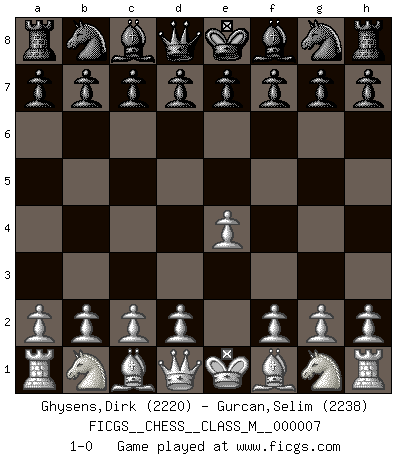 Last move : 1-0 2006 December 22 19:46:52 [Event "FICGS__CHESS__CLASS_M__000007"] [Site "FICGS"] [Date "2006.11.12"] [Round "1"] [White "Ghysens,Dirk"] [Black "Gurcan,Selim"] [Result "1-0"] [WhiteElo "2220"] [BlackElo "2238"] 1.e4 1-0 This chess game has been lost on time (started : 2006.11.12 17:50:40) King's pawn Opening Player White won this chess game. Follow this game move after move (download)Combinations have always been the most intriguing aspect of Chess. The masters look for them, the public applauds them, the critics praise them. It is because combinations are possible that Chess is more than a lifeless mathematical exercise. They are the poetry of the game; they are to Chess what melody is to music. They represent the triumph of mind over matter. (Reuben Fine) Je älter ich werde, um so mehr schätze ich die Bauern. (Paul Keres) Una buena ofensiva y una buena defensa, comienzan ambas con un buen desarrollo. (Bruce A. Moon) Les sacrifices démontrent seulement que quelqu'un a gaffé. (Savielly Tartacover) The next best thing to gambling and winning is gambling and loosing. (Nick Dandalos)