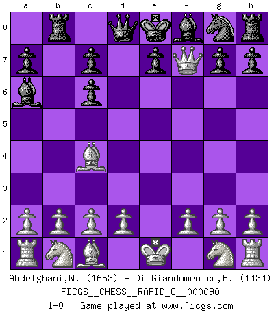 Last move : 1-0 2010 July 25 21:35:8 [Event "FICGS__CHESS__RAPID_C__000090"] [Site "FICGS"] [Date "2010.07.05"] [Round "1"] [White "Abdelghani,Wael"] [Black "Di Giandomenico,Pierino"] [Result "1-0"] [WhiteElo "1653"] [BlackElo "1424"] 1.e4 d5 2.exd5 Nc6 3.dxc6 bxc6 4.Qf3 Rb8 5.Bc4 Ba6 6.Qxf7+ 1-0 Scandinavian (centre counter) defense Player White won this chess game. Follow this game move after move (download)Becoming successful at Chess allows you to discover your own personality. That's what I want for the kids I teach. (Saudin Robovic) Die Idee von Capablanca, Schach als Fach in den Schulen zu lehren, ist großartig. (Fidel Castro) No soy una persona materialista y por eso, no resiento la falta o pérdida del dinero. La ausencia de cosas mundanas carece de importancia. Ya que el Ajedrez es una forma en la que puedo ser tan materialista como yo desee sin tener la necesidad de vender mi alma. (Jamie Walter Adams) Il vaut toujours mieux jouer un plan faux de façon logique que de n'avoir pas de plan du tout. (Victor Kortchnoï) In God we trust, all others we virus scan. (Anonymous)