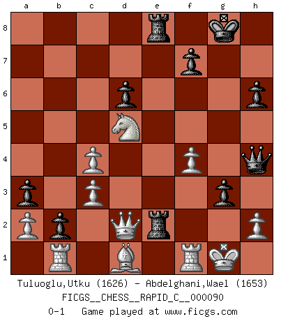 Last move : 0-1 2010 August 4 10:51:8 [Event "FICGS__CHESS__RAPID_C__000090"] [Site "FICGS"] [Date "2010.07.05"] [Round "1"] [White "Tuluoglu,Utku"] [Black "Abdelghani,Wael"] [Result "0-1"] [WhiteElo "1626"] [BlackElo "1653"] 1.e4 c5 2.Nf3 Nc6 3.d4 cxd4 4.Nxd4 Nf6 5.Nc3 e5 6.Ndb5 d6 7.Bg5 a6 8.Na3 b5 9.Nd5 Qa5+ 10.Bd2 Qd8 11.Bd3 Be6 12.Ne3 Be7 13.O-O O-O 14.c4 b4 15.Nac2 Rb8 16.Nd5 a5 17.Nce3 Bxd5 18.Nxd5 Nd4 19.Be3 Ne6 20.g3 Nc5 21.Qc2 h6 22.f4 Ng4 23.Bd2 exf4 24.gxf4 a4 25.Be2 b3 26.Qb1 a3 27.Bxg4 Bf6 28.Bc3 Nxe4 29.Qxe4 Bxc3 30.bxc3 Re8 31.Qd3 b2 32.Rae1 Qh4 33.Be2 Re6 34.Rb1 Rbe8 35.Bf3 g5 36.Qd4 g4 37.Bd1 g3 38.Qd2 Re2 0-1 Sicilian : Pelikan (Lasker/Sveshnikov) variation Kingside Castling by player White (move 13) Kingside Castling by player Black (move 13) Player Black won this chess game. Follow this game move after move (download)In Chess, at least, the brave inherit the earth. (Edmar Mednis) Je älter ich werde, um so mehr schätze ich die Bauern. (Paul Keres) El poder defensivo de una pieza clavada, solamente es imaginario. (Aaron Nimzovich) Les Echecs, c'est l'art de la guerre sans les charniers, c'est la résurrection des morts tombés au champ d'honneur, l'espoir perpétuel, la suprématie de l'intelligence sur la force, la culture de l'esprit. (F. Szpiner) Those who make the worst use of their time are the first to complain of its brevity. (Jean de la Bruyere)