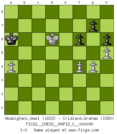 Last move : 1-0 2010 September 8 8:36:19 [Event "FICGS__CHESS__RAPID_C__000090"] [Site "FICGS"] [Date "2010.07.05"] [Round "1"] [White "Abdelghani,Wael"] [Black "Cridland,Graham"] [Result "1-0"] [WhiteElo "1653"] [BlackElo "1580"] 1.e4 c5 2.Nf3 Nc6 3.d4 cxd4 4.Nxd4 e6 5.c4 Nf6 6.Nc3 Bb4 7.f3 d5 8.cxd5 exd5 9.Nxc6 bxc6 10.exd5 Nxd5 11.Bd2 Nxc3 12.Bxc3 Bxc3+ 13.bxc3 O-O 14.Be2 Qb6 15.Rb1 Qc5 16.Qd4 Qxd4 17.cxd4 Be6 18.a3 Rab8 19.Kf2 Rb6 20.Rhc1 Rfb8 21.Rxb6 Rxb6 22.Rc5 Kf8 23.Ra5 Rb7 24.Bd3 Bd5 25.Be4 Rd7 26.Ke3 Ke7 27.Bxd5 cxd5 28.Ra6 Rb7 29.h4 h6 30.Kf4 Kd7 31.g4 Ke7 32.Ke5 Rd7 33.h5 f6+ 34.Kf5 Kf7 35.f4 Kg8 36.Ke6 Rb7 37.Kxd5 Kf7 38.Ke4 Ke7 39.Kf5 Rd7 40.Ke4 Kf8 41.a4 Ke7 42.Kd3 Kf7 43.Kc4 Ke7 44.Kc5 Rc7+ 45.Rc6 Rb7 46.d5 Kd7 47.d6 a5 48.Rc7+ Rxc7+ 49.dxc7 Kxc7 50.Kb5 Kb7 51.Kxa5 Ka7 52.Kb5 Kb7 53.Kc5 Ka6 54.Kd6 1-0 Sicilian defense Kingside Castling by player Black (move 13) 10 pieces endgame at move 49 : White KPPPP , Black KPPPP WHITE : King + 4 Pawns BLACK : King + 4 Pawns 9 pieces endgame at move 51 : White KPPPP , Black KPPP WHITE : King + 4 Pawns BLACK : King + 3 Pawns Player White won this chess game. Follow this game move after move (download)Chess is a matter of delicate judgment, knowing when to punch and how to duck. (Bobby Fischer) Ein Gewinn durch eine ungenaue Kombination, sei sie auch noch so vorzeigbar, erfüllt mich mit Schaudern. (Wilhelm Steinitz) Observen a Garry Kasparov. Después de una derrota, invariablemente el gana la próxima partida. Prácticamente hace pedazos a su siguiente oponente. Eso es algo que tenemos que aprender a lograr. (Maurice Ashley) Le jeu d'échecs fait naître et fortifie en nous plusieurs qualités précieuses dans le cours de l'existence, telles que la prévoyance, la circonspection, la prudence, et la persévérance. (Benjamin Franklin - 1783, la morale des échecs) Faith : not wanting to know what is true. (Friedrich Nietzsche)