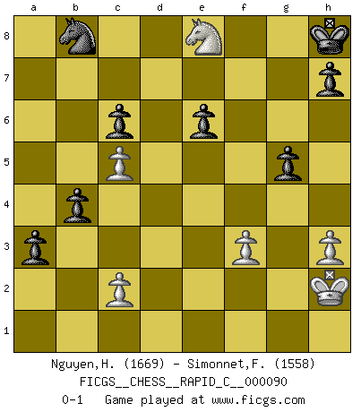 Last move : 0-1 2010 September 26 12:31:47 [Event "FICGS__CHESS__RAPID_C__000090"] [Site "FICGS"] [Date "2010.07.05"] [Round "1"] [White "Nguyen,Hao Nhien"] [Black "Simonnet,Franck"] [Result "0-1"] [WhiteElo "1669"] [BlackElo "1558"] 1.e4 d5 2.d4 dxe4 3.Nc3 Nf6 4.f3 exf3 5.Nxf3 Bg4 6.h3 Bd7 7.Bc4 e6 8.O-O Be7 9.Qe2 Bc6 10.Be3 a6 11.Rad1 b5 12.Bb3 b4 13.Na4 Bb5 14.Qf2 Bxf1 15.Rxf1 O-O 16.Ne5 Nd5 17.Nc5 Bxc5 18.dxc5 f6 19.Nd3 a5 20.Nf4 Re8 21.Qf3 c6 22.Nh5 Kh8 23.Bxd5 Qxd5 24.Qg4 Ra7 25.Rf3 Qxa2 26.Rg3 Qxb2 27.Qe4 a4 28.Kh2 Qe5 29.Qh4 Rd7 30.Bf4 Qf5 31.Rf3 g5 32.Bxg5 Qxg5 33.Qxg5 fxg5 34.Nf6 Rf7 35.Nxe8 Rxf3 36.gxf3 a3 0-1 Scandinavian (centre counter) defense Kingside Castling by player White (move 8) Kingside Castling by player Black (move 15) Player Black won this chess game. Follow this game move after move (download)Help your pieces so they can help you. (Paul Morphy) Je mehr ich von der FIDE weiss, um so weniger verstehe ich. (Alexander Kalifman) Juega la Apertura como un libro, el Juego Medio como un mago y los Finales como una máquina. (Spielmann) Les écrivains ont utilisé les échecs pour analyser les côtés extrêmes de la nature humaine. Dans ce cadre, les échecs offrent un champ d'expérimentation idéal. Mais on pourrait faire la même chose avec la peinture. Et là, en vous référant à Van Gogh, vous ne tirerez pas de conclusion définitive sur les peintres. (Gary Kasparov) Life is verb, not a noun. (Charlotte Perkins Gilman)