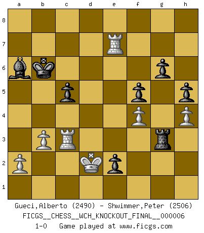 Last move : 1-0 2010 September 16 7:14:10 [Event "FICGS__CHESS__WCH_KNOCKOUT_FINAL__000006"] [Site "FICGS"] [Date "2010.07.06"] [Round "6"] [White "Gueci,Alberto"] [Black "Shwimmer,Peter"] [Result "1-0"] [WhiteElo "2490"] [BlackElo "2506"] 1.d4 Nf6 2.Nf3 e6 3.c4 b6 4.g3 Ba6 5.b3 Bb4+ 6.Bd2 Bxd2+ 7.Qxd2 c6 8.Nc3 d5 9.e4 Nxe4 10.Nxe4 dxe4 11.Ng5 c5 12.Bg2 Nc6 13.dxc5 Qxd2+ 14.Kxd2 f5 15.Nxe6 Kf7 16.Nf4 bxc5 17.f3 Rad8+ 18.Kc3 e3 19.Nd3 Rhe8 20.f4 e2 21.Bd5+ Rxd5 22.cxd5 Re3 23.dxc6 Rxd3+ 24.Kc2 Ke6 25.Rae1 Rd5 26.Rhf1 Kd6 27.Rf3 Kxc6 28.Re3 Kd7 29.Rc1 Rd4 30.h4 h5 31.Re5 Rd6 32.Re1 Kc6 33.Re7 Rg6 34.Rxa7 Kd5 35.Re7 Rxg3 36.Kd2 Kc6 37.Re5 Kb6 38.Rc1 g6 39.Re6+ Kb7 40.Re7+ Kb6 41.Rc3 1-0 Queen's pawn game Player White won this chess game. Follow this game move after move (download)The game of Chess is not merely an idle amusement; several very valuable qualities of the mind are to be acquired and strengthened by it, so as to become habits ready on all occasions; for life is a kind of Chess. (Benjamin Franklin) Kasparov ist eine Art Monster mit hundert Augen, denen auch nicht das Geringste entgeht. (Tony Miles) Una de estas pequeñas movidas modestas pudieran ser mas molestas a tu oponente que la amenaza mas grande. (Siegbert Tarrasch) L'ordinateur a tué l'originalité. Il n'y a plus guère d'aventures sur l'échiquier. (Jacob Murray) The weakness of an artist is dogma. (Josh Waitzkin)
