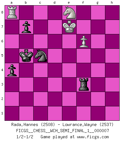 Last move : 1/2-1/2 2011 January 11 23:59:55 [Event "FICGS__CHESS__WCH_SEMI_FINAL_1__000007"] [Site "FICGS"] [Date "2010.07.06"] [Round "8"] [White "Rada,Hannes"] [Black "Lowrance,Wayne"] [Result "1/2-1/2"] [WhiteElo "2508"] [BlackElo "2537"] 1.Nc3 d5 2.e4 d4 3.Nce2 e5 4.Ng3 Nc6 5.Nf3 h5 6.h4 a6 7.Bc4 Bg4 8.c3 Qd7 9.a4 O-O-O 10.a5 g6 11.d3 Bh6 12.Bxh6 Nxh6 13.Qb3 Bxf3 14.gxf3 Qe7 15.Ne2 Qf6 16.Rh3 g5 17.hxg5 Qxg5 18.Rh2 Rd6 19.Bd5 Rhd8 20.Kf1 h4 21.cxd4 exd4 22.Bxf7 Nxa5 23.Qa2 Nxf7 24.Qxa5 Rb6 25.f4 Qg4 26.b4 h3 27.Rc1 Kb8 28.Ke1 Rg8 29.Qd5 Nh6 30.Qe5 Qd7 31.f3 Nf7 32.Qxd4 Rd6 33.Qa1 Rxd3 34.Rd1 Rxd1+ 35.Qxd1 Qe6 36.Qd5 Qxd5 37.exd5 Rh8 38.Kf2 Nd6 39.Nd4 Rh5 40.Kg3 Rxd5 41.Ne6 Rb5 42.Rxh3 Nf5+ 43.Kg4 Ne3+ 44.Kg3 Rxb4 45.Rh8+ Ka7 46.Nxc7 Kb6 47.Ne6 Nf5+ 48.Kg4 Rb5 49.Kg5 a5 50.Kf6 Nd6 51.Ra8 Rf5+ 52.Kg6 Rd5 53.Ng7 Rd3 54.Ne8 Nc4 55.f5 Rxf3 56.f6 Ne5+ 57.Kg7 Rg3+ 58.Kf8 Re3 59.Nd6 Nd7+ 60.Kf7 Rf3 61.Ne8 Kb5 62.Ke6 Nc5+ 63.Ke7 Re3+ 64.Kd6 Rf3 65.Ke7 a4 1/2-1/2 Dunst (Sleipner, Heinrichsen) Opening Queenside Castling by player Black (move 9) 10 pieces endgame at move 46 : White KRNPP , Black KRNPP WHITE : King + 1 Rook 1 Knight 2 Pawns BLACK : King + 1 Rook 1 Knight 2 Pawns 9 pieces endgame at move 55 : White KRNP , Black KRNPP WHITE : King + 1 Rook 1 Knight 1 Pawn BLACK : King + 1 Rook 1 Knight 2 Pawns This chess game ended in a draw. Follow this game move after move (download)All I want to do, ever, is just play Chess. (Bobby Fischer) Ohne ihre Erfolge schmälern zu wollen würde ich sagen Petrosian, Spassky und Karpov verdanken ihre Siege ihren Trainern - Boleslavsky, Bondarevsky und Furman. (Mikhail Moiseyevich Botvinik) Tu cuerpo tiene que estar en óptima condición. Tu Ajedrez se deteriora como lo hace tu cuerpo. No puedes separar la mente y el cuerpo. (Bobby Fischer) L'action d'une oeuvre littéraire se déroule sur un champ de bataille. Les masques et les types du drame moderne correspondent aux pièces du jeu d'échecs. L'intrigue correspond aux coups et aux gambits, c'est à dire aux techniques du jeu telles qu'utilisées et interprétées par les joueurs. Les tactiques et les péripéties [mouvements] correspondent aux coups exécutés par l'adversaire. (Viktor Shklovsky) A proverb is a short sentence based on long experience. (Miguel de Cervantes)