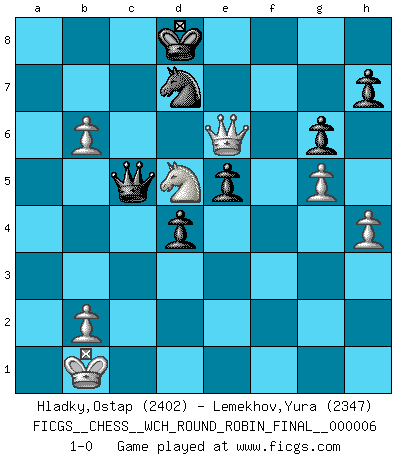 Last move : 1-0 2010 November 25 21:32:45 [Event "FICGS__CHESS__WCH_ROUND_ROBIN_FINAL__000006"] [Site "FICGS"] [Date "2010.07.06"] [Round "1"] [White "Hladky,Ostap"] [Black "Lemekhov,Yura"] [Result "1-0"] [WhiteElo "2402"] [BlackElo "2347"] 1.e4 c5 2.Nf3 d6 3.d4 cxd4 4.Nxd4 Nf6 5.Nc3 a6 6.Be3 e5 7.Nb3 Be6 8.f3 Be7 9.Qd2 O-O 10.O-O-O Nbd7 11.g4 b5 12.g5 b4 13.Ne2 Ne8 14.f4 a5 15.f5 a4 16.fxe6 axb3 17.cxb3 fxe6 18.Bh3 Rxa2 19.Bxe6+ Kh8 20.Ng3 Nc7 21.Bc4 Qa8 22.Rhf1 Rxf1 23.Rxf1 Ra1+ 24.Kc2 Rxf1 25.Bxf1 d5 26.Qf2 Qc6+ 27.Kb1 d4 28.Bd2 g6 29.h4 Qd6 30.Bd3 Nb6 31.Qf3 Ne6 32.Nh1 Nf4 33.Nf2 Nxd3 34.Nxd3 Qe6 35.Bxb4 Bxb4 36.Nxb4 Kg8 37.Qd3 Qg4 38.Ka2 Qc8 39.Qb5 Qa8+ 40.Na6 Nd7 41.b4 Kf8 42.Qc4 Ke7 43.b5 Qxe4 44.Nc7 Qb7 45.Qe6+ Kd8 46.Nd5 Qa7+ 47.Kb1 Qc5 48.b6 1-0 Sicilian : Najdorf, Byrne (English) attack Kingside Castling by player Black (move 9) Queenside Castling by player White (move 10) Player White won this chess game. Follow this game move after move (download)The enormous mental resilience, without which no Chess player can exist, was so much taken up by Chess that he could never free his mind of this game. (Albert Einstein) Nie in meinem Leben habe ich die französische Verteidigung gespielt, welche die Stumpfsinnigste von allen ist. (Wilhelm Steinitz) Cualquier cambio de material en una posición debe venir por medio de un mate, una captura o promoción de Peón. (Purdy) Les Echecs ont trois composantes : le temps, l'espace et le matériel en dernier. (Mikhail Tal) There are two kinds of people in the world, my friend. Those who have a loaded gun and those who dig. You dig ! (Blondie in The Good, The Bad and The Ugly)
