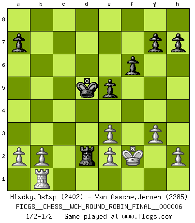 Last move : 1/2-1/2 2010 August 3 8:1:31 [Event "FICGS__CHESS__WCH_ROUND_ROBIN_FINAL__000006"] [Site "FICGS"] [Date "2010.07.06"] [Round "1"] [White "Hladky,Ostap"] [Black "Van Assche,Jeroen"] [Result "1/2-1/2"] [WhiteElo "2402"] [BlackElo "2285"] 1.Nf3 Nf6 2.g3 c5 3.Bg2 Nc6 4.O-O d5 5.d4 cxd4 6.Nxd4 e5 7.Nxc6 bxc6 8.c4 Be6 9.Nc3 Rc8 10.cxd5 cxd5 11.Qa4+ Qd7 12.Qxd7+ Kxd7 13.Rd1 Bc5 14.Nxd5 Nxd5 15.Bxd5 Bxd5 16.Rxd5+ Ke6 17.Rd2 Rhd8 18.Kf1 Bb6 19.Rxd8 Rxd8 20.Bg5 f6 21.Be3 Bxe3 22.fxe3 Rd2 23.Rb1 Kd5 24.Kf2 1/2-1/2 Reti Opening Kingside Castling by player White (move 4) This chess game ended in a draw. Follow this game move after move (download)I play correspondence chess because it is both art and science while chess is art only. (A player at FICGS) Die Jungen erwarten, dass Opa einfach umfällt. Dann aber kann Opa fünf Stunden lang Schach spielen und die jungen Gegner an die Wand drücken. (Viktor Kortschnoi) Yo adoro todas la posiciones. Denme una partida posicional difícil, y la jugaré. Pero posiciones totalmente ganadas, no las tolero. (Hein Donner) Il vaut toujours mieux jouer un plan faux de façon logique que de n'avoir pas de plan du tout. (Victor Kortchnoï) The absolute truth is the thing that makes people laugh. (Carl Reiner)