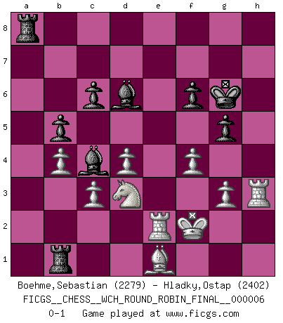 Last move : 0-1 2011 January 22 12:44:0 [Event "FICGS__CHESS__WCH_ROUND_ROBIN_FINAL__000006"] [Site "FICGS"] [Date "2010.07.06"] [Round "1"] [White "Boehme,Sebastian"] [Black "Hladky,Ostap"] [Result "0-1"] [WhiteElo "2279"] [BlackElo "2402"] 1.e4 e5 2.Nf3 Nc6 3.Bb5 a6 4.Ba4 Nf6 5.O-O Be7 6.Re1 b5 7.Bb3 O-O 8.c3 d5 9.exd5 Nxd5 10.Nxe5 Nxe5 11.Rxe5 c6 12.d4 Bd6 13.Re1 Qh4 14.g3 Qh3 15.Be3 Bg4 16.Qd3 Rae8 17.Nd2 Qh5 18.a4 Re6 19.axb5 axb5 20.Bxd5 Qxd5 21.Qf1 Rg6 22.Rac1 h5 23.Qg2 Qf5 24.Ra1 Re6 25.f3 Bh3 26.Qf2 Rg6 27.Ne4 Bb8 28.Bd2 Qd5 29.f4 h4 30.Re3 hxg3 31.hxg3 f6 32.b4 Be6 33.Ra6 Rd8 34.Qf3 Rc8 35.Nc5 Qxf3 36.Rxf3 Bd5 37.Kf2 Rh6 38.Re3 Rh2+ 39.Ke1 Kf7 40.Kd1 Kg6 41.Nd3 Kf5 42.Rb6 Rg2 43.Rb7 g5 44.Rh7 Kg6 45.Rh3 Rf8 46.Ke1 Bd6 47.Re2 Rg1+ 48.Kf2 Rd1 49.Nb2 Rb1 50.Be1 Ra8 51.Nd3 Bc4 0-1 Ruy Lopez : Closed, 7...O-O Kingside Castling by player White (move 5) Kingside Castling by player Black (move 7) Player Black won this chess game. Follow this game move after move (download)Nonsense was the last thing Fischer was interested in, as far as Chess was concerned. (Elie Agur) Alles was am Schachbrett zählt sind gute Züge. (Robert James Fischer) Diferente gente reacciona diferentemente en aceptar la derrota. (Bobby Fischer) Vouloir jouer aux échecs contre soi-même est aussi paradoxal que vouloir marcher sur son ombre. (Stefan Zweig) Just because you do not take an interest in politics doesn't mean politics won't take an interest in you. (Pericles 430 B.C.)