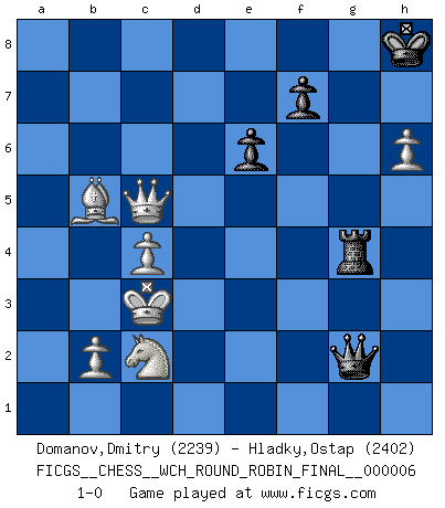 Last move : 1-0 2010 November 25 23:6:52 [Event "FICGS__CHESS__WCH_ROUND_ROBIN_FINAL__000006"] [Site "FICGS"] [Date "2010.07.06"] [Round "1"] [White "Domanov,Dmitry"] [Black "Hladky,Ostap"] [Result "1-0"] [WhiteElo "2239"] [BlackElo "2402"] 1.e4 c5 2.Nf3 d6 3.d4 cxd4 4.Nxd4 Nf6 5.Nc3 a6 6.Be3 e6 7.f3 b5 8.Qd2 Nbd7 9.g4 b4 10.Na4 h6 11.O-O-O Ne5 12.Qxb4 Bd7 13.Bf4 g5 14.Bd2 Rb8 15.Qa3 Be7 16.h4 gxh4 17.Bb4 Qc7 18.Bxa6 O-O 19.Rxh4 Bxa4 20.Qxa4 Qb6 21.Bb5 Nxe4 22.Rh2 Ra8 23.Qb3 Nc5 24.Qe3 Bg5 25.f4 Rxa2 26.fxg5 Nxg4 27.Qe2 Nxh2 28.gxh6 Kh8 29.c4 Ra1+ 30.Kc2 Rxd1 31.Kxd1 Qb7 32.Qxh2 Qe4 33.Nc2 Rg8 34.Qf2 Rg4 35.Bxc5 dxc5 36.Qxc5 Qd3+ 37.Kc1 Qf1+ 38.Kd2 Qg2+ 39.Kc3 1-0 Sicilian : Najdorf, Byrne (English) attack Queenside Castling by player White (move 11) Kingside Castling by player Black (move 18) Player White won this chess game. Follow this game move after move (download)All I want to do, ever, is just play Chess. (Bobby Fischer) Kritik überlasse ich den Spießern. Ich zeige nichts, wofür ich mich schämen muss. (Alexandra Kosteniuk) El Peón aislado arroja penumbra sobre todo el tablero. (Aaron Nimzovich) Je crois qu'il existe des manières très spécifiques de jouer efficacement contre une machine. Evidemment, nous n'avons aucune chance en technique pure, parce que l'ordinateur calcule de manière parfaite. Mais lorsque nous faisons appel à notre cerveau, en utilisant l'intuition et la compréhension, alors nous restons beaucoup plus forts. (Anatoli Karpov) God is an atheist. (Unknown)