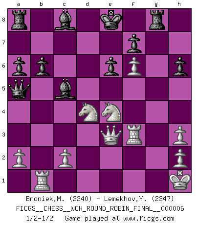 Last move : 1/2-1/2 2010 October 7 20:5:17 [Event "FICGS__CHESS__WCH_ROUND_ROBIN_FINAL__000006"] [Site "FICGS"] [Date "2010.07.06"] [Round "1"] [White "Broniek,Mariusz Maciej"] [Black "Lemekhov,Yura"] [Result "1/2-1/2"] [WhiteElo "2240"] [BlackElo "2347"] 1.e4 c5 2.Nf3 d6 3.d4 cxd4 4.Nxd4 Nf6 5.Nc3 a6 6.Bg5 e6 7.f4 Qb6 8.Qd2 Qxb2 9.Rb1 Qa3 10.e5 h6 11.Bh4 dxe5 12.fxe5 g5 13.exf6 gxh4 14.Be2 Qa5 15.O-O h3 16.Qe3 Bc5 17.Bf3 Nd7 18.Ne4 Ne5 19.gxh3 Rg8+ 20.Kh1 Nxf3 21.Rxf3 b6 1/2-1/2 Sicilian : Najdorf, 7...Qb6 Kingside Castling by player White (move 15) This chess game ended in a draw. Follow this game move after move (download)The older I grow, the more I value pawns. (Paul Keres) Auf jeden Fall musst du zuerst Rechtsanwalt werden, damit du deine eigenen Interessen und die deiner Familie vertreten kannst. [Brief an seinen Sohn] (José Raúl Capablanca) En el tablero, la mentira e hipocresía no sobreviven mucho. (Emanuel Lasker) Fischer est le meilleur joueur du monde et Karpov n'est qu'un joueur de bistrot. (Garry Kasparov, agé de 16 ans) You lose, general Kenobi. (General Grievous in Star Wars ep.3)