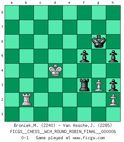 Last move : 0-1 2010 December 13 10:29:9 [Event "FICGS__CHESS__WCH_ROUND_ROBIN_FINAL__000006"] [Site "FICGS"] [Date "2010.07.06"] [Round "1"] [White "Broniek,Mariusz Maciej"] [Black "Van Assche,Jeroen"] [Result "0-1"] [WhiteElo "2240"] [BlackElo "2285"] 1.e4 c5 2.Nf3 d6 3.d4 cxd4 4.Nxd4 Nf6 5.Nc3 a6 6.Bg5 e6 7.f4 Qb6 8.Qd2 Qxb2 9.Rb1 Qa3 10.e5 h6 11.Bh4 dxe5 12.fxe5 g5 13.exf6 gxh4 14.Be2 Qa5 15.O-O Nd7 16.Kh1 Qg5 17.Rf4 e5 18.Nd5 exd4 19.Bf3 Bd6 20.Qxd4 Ne5 21.Ne7 Nxf3 22.Qxd6 h3 23.g3 Qe5 24.Qxe5 Nxe5 25.Re4 Be6 26.Rxe5 b5 27.Kg1 Kd7 28.a4 Kd6 29.Rh5 Bg4 30.Rd5+ Ke6 31.Rd4 h5 32.axb5 axb5 33.Nd5 Ke5 34.Rd3 Rhb8 35.Rd2 Kf5 36.Kf2 Kg6 37.Nc7 Ra5 38.Rb4 Rc8 39.Rxb5 Ra2 40.Rb7 Bf5 41.Ke3 Ra3+ 42.Kd4 Ra4+ 43.c4 Bd7 44.Kd5 Ra5+ 45.Kd6 Bf5 46.R7b2 Ra7 47.Nb5 Ra6+ 48.Kd5 Be6+ 49.Ke4 Rxc4+ 50.Nd4 Kxf6 51.Ke3 Bg4 52.Rb8 Rc3+ 53.Kf4 Ra4 54.Rb6+ Kg7 55.Kg5 R3c4 56.Rd6 Rc5+ 57.Kf4 f6 58.Ke4 Kg6 59.Rb6 Rc3 60.Rf2 Bf3+ 61.Rxf3 Rxd4+ 62.Kxd4 Rxf3 63.Rb2 f5 0-1 This chess game has been lost on time (started : 2010.07.06 0:15:57) Sicilian : Najdorf, 7...Qb6 Kingside Castling by player White (move 15) 10 pieces endgame at move 62 : White KRRPP , Black KRPPP WHITE : King + 2 Rooks 2 Pawns BLACK : King + 1 Rook 3 Pawns 9 pieces endgame at move 62 : White KRPP , Black KRPPP WHITE : King + 1 Rook 2 Pawns BLACK : King + 1 Rook 3 Pawns Player Black won this chess game. Follow this game move after move (download)In the perfect Chess combination as in a first-rate short story, the whole plot and counter-plot should lead up to a striking finale, the interest not being allayed until the very last moment. (Yates and Winter) Garry Kasparov war erst in der Großmeister-Organisation GMA, dann in der Profischach-Vereinigung PCA, zum Schluss kehrte er wieder in den Schoß der FIDE zurück. Aber gut, manche Leute sind flexibel (Viswanathan Anand) De todos mis libros Rusos, la defensa contiene y difunde el 'calor' mas grande que pudiese verse extraño al observar lo supremamente abstracto que el Ajedrez supuestamente es. (Vladimir Nabokov) RxDa4 pat (...) There are two types of people in this world, good and bad. The good sleep better, but the bad seem to enjoy the waking hours much more. (Woody Allen)