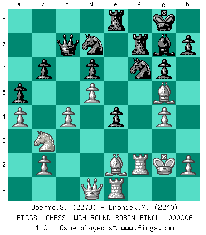 Last move : 1-0 2010 November 21 22:38:9 [Event "FICGS__CHESS__WCH_ROUND_ROBIN_FINAL__000006"] [Site "FICGS"] [Date "2010.07.06"] [Round "1"] [White "Boehme,Sebastian"] [Black "Broniek,Mariusz Maciej"] [Result "1-0"] [WhiteElo "2279"] [BlackElo "2240"] 1.e4 c5 2.Nf3 d6 3.d4 cxd4 4.Nxd4 Nf6 5.Nc3 a6 6.Be2 e5 7.Nb3 Be7 8.O-O O-O 9.Be3 Be6 10.Qd3 Nbd7 11.Nd5 Bxd5 12.exd5 Ne8 13.Qd2 f5 14.g3 Nef6 15.f3 Qc7 16.c4 a5 17.a4 b6 18.Bd3 g6 19.Rae1 Rf7 20.Kg2 Bf8 21.Bg5 Bg7 22.Qd1 Re8 23.Qd2 Qb7 24.Qc2 R7f8 25.Rf2 Rc8 26.Qd1 Qc7 27.Rc2 Rce8 28.Rce2 Ra8 29.Rf2 Rab8 30.Qc2 Rbe8 31.Qd1 Rf7 32.g4 fxg4 33.fxg4 e4 34.Be2 1-0 This chess game has been lost on time (started : 2010.07.06 0:15:57) Sicilian : Najdorf, Opovcensky variation Kingside Castling by player White (move 8) Kingside Castling by player Black (move 8) Player White won this chess game. Follow this game move after move (download)Half the variations which are calculated in a tournament game turn out to be completely superfluous. Unfortunately, no one knows in advance which half. (Jan Tinman) Über Karpov: Er war und ist ein Vertreter der russischen Reaktionäre. Das steckt tief in seiner Seele, wehalb ich nicht nett mit ihm umgehen kann. (Viktor Kortschnoi) Debemos de asegurarnos de que el Ajedrez no se convierta en un lenguaje muerto, muy interesante, pero tan solo para un grupo muy pequeño. (Sytze Faber) Le pion, dans sa simplicité, marche droit devant lui, mais lorsqu'il prend, il le fait obliquement? Ainsi l'homme, tant qu'il reste pauvre, marche dans la droiture et vit honnêtement, mais lorsqu'il recherche les honneurs, il flatte, se parjure et, par les voies obliques, cherche une position supérieure sur l'échiquier du monde. (Jean de Galles) Perseverance does not equal worthiness. Next time you want to get my attention, wear something fun. Low-riding jeans are hot. (Gregory House, House M.D.)