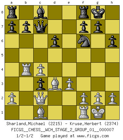 Last move : 1/2-1/2 2010 August 9 16:27:53 [Event "FICGS__CHESS__WCH_STAGE_2_GROUP_01__000007"] [Site "FICGS"] [Date "2010.07.06"] [Round "1"] [White "Sharland,Michael"] [Black "Kruse,Herbert"] [Result "1/2-1/2"] [WhiteElo "2215"] [BlackElo "2374"] 1.d4 Nf6 2.c4 e6 3.Nc3 Bb4 4.e3 c5 5.Bd3 Nc6 6.Nf3 Bxc3+ 7.bxc3 d6 8.O-O e5 9.Nd2 O-O 10.Rb1 h6 11.Ne4 exd4 12.cxd4 Nb4 13.Nc3 cxd4 14.Rxb4 dxc3 15.Qc2 Qc7 1/2-1/2 Nimzo-Indian : e3, Huebner variation Kingside Castling by player White (move 8) Kingside Castling by player Black (move 9) This chess game ended in a draw. Follow this game move after move (download)The most important feature of the Chess position is the activity of the pieces. This is absolutely fundamental in all phases of the game: Opening, Middlegame and especially Endgame. The primary constraint on a piece's activity is the Pawn structure. (Michael Stean) Ein Isolani verdüstert die Stimmung auf dem ganzen Schachbrett. (Savielly Grigorievitsch Tartakower) Cuando veas una buena jugada, trata de encontrar otra mejor. (Emanuel Lasker) Il vaut toujours mieux jouer un plan faux de façon logique que de n'avoir pas de plan du tout. (Victor Kortchnoï) The mind is like a parachute, it only functions when its open. (Unknown)