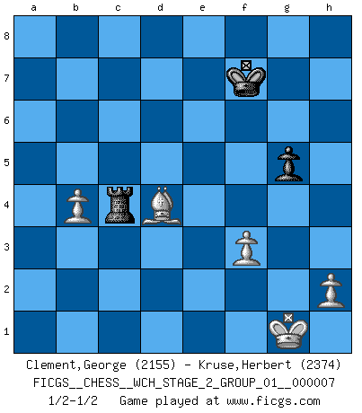 Last move : 1/2-1/2 2010 September 3 17:37:58 [Event "FICGS__CHESS__WCH_STAGE_2_GROUP_01__000007"] [Site "FICGS"] [Date "2010.07.06"] [Round "1"] [White "Clement,George"] [Black "Kruse,Herbert"] [Result "1/2-1/2"] [WhiteElo "2155"] [BlackElo "2374"] 1.e4 c5 2.Nf3 d6 3.Bb5+ Nd7 4.O-O a6 5.Bxd7+ Bxd7 6.Nc3 e5 7.d3 b5 8.a4 Ne7 9.Nd2 g6 10.f4 exf4 11.Qf3 g5 12.e5 dxe5 13.axb5 Bg7 14.Rxa6 Rxa6 15.bxa6 O-O 16.Nce4 f5 17.Nxg5 h6 18.Nh3 Rf6 19.a7 Bc6 20.Qe2 Qc7 21.Nf3 Rg6 22.d4 cxd4 23.Qc4+ Nd5 24.Bxf4 Kh7 25.Nh4 Rg4 26.Bg3 Ne3 27.Qc5 Qd7 28.Nf2 Rg5 29.Nf3 Nxf1 30.Kxf1 f4 31.Bxf4 Rf5 32.Nxe5 Bxe5 33.Bxe5 Qe6 34.a8Q Bxa8 35.Qa7+ Rf7 36.Qb8 Bb7 37.Qh8+ Kg6 38.Kg1 Rh7 39.Qb8 Re7 40.Nd3 Kf7 41.Qh8 Qg6 42.Bg3 Qe4 43.Ne1 Re6 44.Qd8 Qe3+ 45.Bf2 Qg5 46.Qxg5 hxg5 47.Nf3 Bxf3 48.gxf3 Re2 49.Bxd4 Rxc2 50.b4 Rc4 1/2-1/2 Sicilian : Canal-Sokolsky (Nimzovich-Rossolimo, Moscow) attack Kingside Castling by player White (move 4) Kingside Castling by player Black (move 15) Promotion Queen by player White (move 34) 10 pieces endgame at move 48 : White KBPPPP , Black KRPP WHITE : King + 1 Bishop 4 Pawns BLACK : King + 1 Rook 2 Pawns 9 pieces endgame at move 49 : White KBPPPP , Black KRP WHITE : King + 1 Bishop 4 Pawns BLACK : King + 1 Rook 1 Pawn 8 pieces endgame at move 49 : White KBPPP , Black KRP WHITE : King + 1 Bishop 3 Pawns BLACK : King + 1 Rook 1 Pawn This chess game ended in a draw. Follow this game move after move (download)Spassky will not be psyched out by Fischer. (Mike Goodall) Ich liebe den Moment, wenn ich das Ego meines Gegenüber breche. (Robert James Fischer) Fischer sacrificó virtualmente todo lo que la mayoría de nosotros los 'debiles' (término que él usa) valoramos, respetamos y apreciamos por el amor de un astuto, a menudo hermoso tablero de juego, por el privilegio ambivalente de ser su mas grande maestro. (Paul Kollar) Nous sommes les pions de la mystérieuse partie d'Echecs jouée par Dieu. Il nous déplace, nous arrête, nous pousse encore, puis nous lance un à un dans la boîte du Néant. Epitaphe sur la tombe de David Janowsky (1868-1927). Treat your password like your toothbrush. Don't let anybody else use it, and get a new one every six months. (Clifford Stoll)