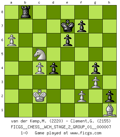 Last move : 1-0 2010 October 12 18:13:56 [Event "FICGS__CHESS__WCH_STAGE_2_GROUP_01__000007"] [Site "FICGS"] [Date "2010.07.06"] [Round "1"] [White "van der Kemp,Michel"] [Black "Clement,George"] [Result "1-0"] [WhiteElo "2220"] [BlackElo "2155"] 1.e4 e6 2.d4 d5 3.Nc3 Nf6 4.Bg5 Be7 5.e5 Nfd7 6.h4 Bxg5 7.hxg5 Qxg5 8.Nh3 Qe7 9.Qg4 Kf8 10.O-O-O c5 11.Nb5 Nc6 12.c3 a6 13.Nd6 Ndxe5 14.dxe5 Nxe5 15.Nxc8 Nxg4 16.Nxe7 Kxe7 17.Be2 h5 18.Rhe1 Rad8 19.Rd2 Nf6 20.Bf3 b5 21.b3 a5 22.Nf4 Kd6 23.Nd3 Nd7 24.c4 bxc4 25.bxc4 d4 26.Rb2 h4 27.Rb5 h3 28.Rxa5 Rb8 29.g3 h2 30.Bh1 g5 31.Ra7 Rhg8 32.a4 Rbf8 33.a5 g4 34.Kc2 Rc8 35.Rb7 Rb8 36.Rxb8 Nxb8 37.Rb1 Ke7 38.Nxc5 Rc8 39.Rxb8 Rxb8 40.a6 1-0 French : Albin-Alekhine-Chatard attack Queenside Castling by player White (move 10) Player White won this chess game. Follow this game move after move (download)My style is somewhere between that of Tal and Petrosian. (Reshevsky) Ein Teil des Fehlers ist immer korrekt. (Savielly Grigorievitsch Tartakower) El Ajedrez moderno está demasiado preocupado con cosas como la estructura de Peones. Olvidenlo, el Jaque Mate termina la partida. (Nigel Short) Fischer est le meilleur joueur du monde et Karpov n'est qu'un joueur de bistrot. (Garry Kasparov, agé de 16 ans) I find television to be very educating. Every time somebody turns on the set, I go in the other room and read a book. (Groucho Marx)