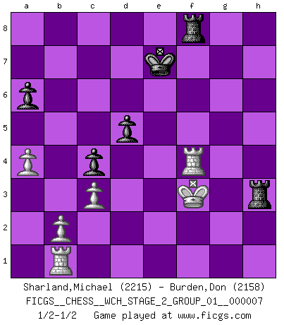 Last move : 1/2-1/2 2010 November 11 23:42:3 [Event "FICGS__CHESS__WCH_STAGE_2_GROUP_01__000007"] [Site "FICGS"] [Date "2010.07.06"] [Round "1"] [White "Sharland,Michael"] [Black "Burden,Don"] [Result "1/2-1/2"] [WhiteElo "2215"] [BlackElo "2158"] 1.e4 c5 2.Nf3 d6 3.d4 cxd4 4.Nxd4 Nf6 5.Nc3 a6 6.Be3 Ng4 7.Bg5 h6 8.Bh4 g5 9.Bg3 Bg7 10.h3 Ne5 11.Qd2 Nbc6 12.Nb3 b5 13.Nd5 Nc4 14.Bxc4 bxc4 15.Nc1 f5 16.exf5 Bxf5 17.Ne3 Be6 18.c3 Rb8 19.Ne2 Qb6 20.Rb1 O-O 21.h4 Qa5 22.a3 Rb3 23.hxg5 Qxg5 24.Qc2 Bf5 25.Nxf5 Qxf5 26.Qxf5 Rxf5 27.Rh4 d5 28.Bf4 h5 29.Be3 Ne5 30.f4 Ng4 31.Bd4 e5 32.fxe5 Nxe5 33.Bxe5 Rxe5 34.g3 Bf8 35.g4 hxg4 36.Rxg4+ Kf7 37.a4 Rh5 38.Kf2 Ba3 39.Ke3 Bc5+ 40.Nd4 Ke7 41.Kf3 Bxd4 42.Rxd4 Rb8 43.Rg4 Rf8+ 44.Rf4 Rh3+ 1/2-1/2 Sicilian : Najdorf, Byrne (English) attack Kingside Castling by player Black (move 20) This chess game ended in a draw. Follow this game move after move (download)The older I grow, the more I value Pawns. (Keres) Die Jungen erwarten, dass Opa einfach umfällt. Dann aber kann Opa fünf Stunden lang Schach spielen und die jungen Gegner an die Wand drücken. (Viktor Kortschnoi) Aún deseo matar a Fischer. (Boris Spassky) Vous n'êtes pas toujours obligé de jouer le meilleur coup. Un coup doit être actif, entreprenant, correct et beau ! (David Bronstein) Philosophers use a language that is already deformed as though by shoes that are too tight. (Ludwig Wittgenstein)