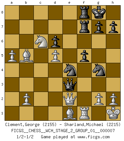 Last move : 1/2-1/2 2010 September 1 16:29:16 [Event "FICGS__CHESS__WCH_STAGE_2_GROUP_01__000007"] [Site "FICGS"] [Date "2010.07.06"] [Round "1"] [White "Clement,George"] [Black "Sharland,Michael"] [Result "1/2-1/2"] [WhiteElo "2155"] [BlackElo "2215"] 1.e4 c5 2.Nf3 d6 3.d4 cxd4 4.Nxd4 Nf6 5.Nc3 a6 6.Be3 e5 7.Nb3 Be6 8.Be2 Be7 9.O-O O-O 10.Qd3 Nbd7 11.Nd5 Bxd5 12.exd5 Ne8 13.Qd2 f5 14.f4 Nef6 15.Qb4 b5 16.c4 exf4 17.Rxf4 Ne4 18.cxb5 Bg5 19.bxa6 Bxf4 20.Bxf4 Nb8 21.a7 Rxa7 22.Be3 Raf7 23.Nd4 Nd7 24.a4 Qf6 25.Rf1 Nec5 26.a5 Re8 27.Bf2 Ne4 28.Be1 Rb8 29.Bb5 Qg5 30.Nc6 Rbf8 31.Qc4 Qe3+ 32.Kh1 Ne5 33.Qe2 Ng4 1/2-1/2 Sicilian : Najdorf, Byrne (English) attack Kingside Castling by player White (move 9) Kingside Castling by player Black (move 9) This chess game ended in a draw. Follow this game move after move (download)I played Chess with him and would have beaten him sometimes only he always took back his last move, and ran the game out differently. (Mark Twain) Schach ist Leben. (Robert James Fischer) ¿Porque tengo que perder ante este idiota?. (Aron Nimzovich) Le thème de l'attaque double intervient d'une manière ou d'une autre dans l'immense majorité des combinaisons. (Youri Averbakh) The question of whether computers can think is just like question of whether submarines can swim. (Edsger W. Dijkstra)