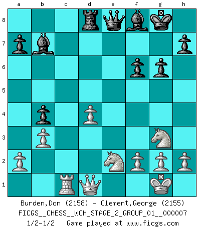 Last move : 1/2-1/2 2010 September 4 17:24:6 [Event "FICGS__CHESS__WCH_STAGE_2_GROUP_01__000007"] [Site "FICGS"] [Date "2010.07.06"] [Round "1"] [White "Burden,Don"] [Black "Clement,George"] [Result "1/2-1/2"] [WhiteElo "2158"] [BlackElo "2155"] 1.e4 e5 2.Nf3 Nc6 3.Bc4 Nf6 4.Ng5 d5 5.exd5 Na5 6.Bb5+ c6 7.dxc6 bxc6 8.Bd3 Nd5 9.Nf3 Bd6 10.O-O Nf4 11.Re1 Nxd3 12.cxd3 O-O 13.Nc3 Re8 14.Ne4 c5 15.b3 Bf8 16.Bb2 Nc6 17.Rc1 f6 18.Ba3 Nb4 19.Bxb4 cxb4 20.d4 exd4 21.Ng3 Bb7 22.Rxe8 Qxe8 23.Nxd4 Rd8 24.Nde2 g6 25.d4 1/2-1/2 Two knights defense Kingside Castling by player White (move 10) Kingside Castling by player Black (move 12) This chess game ended in a draw. Follow this game move after move (download)That's what Chess is all about. One day you give your opponent a lesson, the next day he gives you one. (Bobby Fischer) Jede Eröffnung ist gut genug um gespielt zu werden, wenn nur ihr Ruf schlecht genug ist. (Savielly Grigorievitsch Tartakower) La vida es como un juego de Ajedrez, cambiando con cada movimiento. (Proverbio Chino) Un journaliste : 'Vous préférez avoir une dame de plus sur l'échiquier ou au lit ?' Boris Spassky : 'Ca dépend de la position.' Yoga is 99% practice and 1% knowledge. (Sri Krishna Pattabhi Jois)
