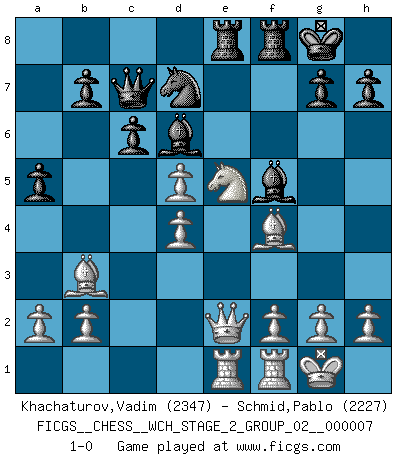 Last move : 1-0 2010 October 1 9:16:55 [Event "FICGS__CHESS__WCH_STAGE_2_GROUP_02__000007"] [Site "FICGS"] [Date "2010.07.06"] [Round "1"] [White "Khachaturov,Vadim"] [Black "Schmid,Pablo"] [Result "1-0"] [WhiteElo "2347"] [BlackElo "2227"] 1.e4 e5 2.Nf3 Nc6 3.Bb5 f5 4.Nc3 Nd4 5.exf5 c6 6.Ba4 Nf6 7.O-O Bc5 8.Nxe5 d5 9.Ne2 O-O 10.c3 Nxe2+ 11.Qxe2 Bxf5 12.d4 Bd6 13.Bf4 Qc7 14.Rae1 Rae8 15.Bb3 a5 16.c4 Nd7 17.cxd5 1-0 This chess game has been lost on time (started : 2010.07.06 16:57:51) Ruy Lopez : Schliemann defense, Berger variation Kingside Castling by player White (move 7) Kingside Castling by player Black (move 9) Player White won this chess game. Follow this game move after move (download)I still hope to kill Fischer. (Boris Spassky) Irgendwie scheint mir sonntags früh um 9 Uhr der Killerinstinkt verloren gegangen zu sein. (Alexej Shirov) La esencia del Ajedrez es pensar acerca de lo que el Ajedrez es. (David Bronstein) Dans le domaine de la peinture, de la gravure et de la sculpture, dès la première décennie de notre siècle, les artistes abandonnent la représentation de la partie d'échecs pour se concentrer sur les pièces, sur les échiquiers et sur toutes les variations auxquelles les unes et les autres peuvent donner lieu. On passe en quelque sorte d'un thème social à un thème musical (au sens de la musica médiévale, c'est-à-dire d'une notion qui inclue le rythme, l'harmonie, la construction et la déconstruction, etc.). Graphiquement et picturalement, l'échiquier apparaît comme une structure ouverte, dynamique, d'une richesse infinie, autorisant toutes les combinatoires et débouchant sur des mouvements et des rythmes de nature exponentielle. (Michel Pastoureau) The hypothalamus is one of the most important parts of the brain, involved in many kinds of motivation, among other functions. The hypothalamus controls the 'Four Fs: Fighting, Fleeing, Feeding and Mating. (Unknown author)
