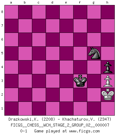 Last move : 0-1 2011 March 4 16:58:18 [Event "FICGS__CHESS__WCH_STAGE_2_GROUP_02__000007"] [Site "FICGS"] [Date "2010.07.06"] [Round "1"] [White "Drazkowski,Krzysztof"] [Black "Khachaturov,Vadim"] [Result "0-1"] [WhiteElo "2208"] [BlackElo "2347"] 1.d4 Nf6 2.c4 e6 3.Nf3 b6 4.Nc3 Bb7 5.a3 d5 6.cxd5 Nxd5 7.Bd2 Nd7 8.Qc2 c5 9.e4 Nxc3 10.Bxc3 cxd4 11.Nxd4 a6 12.g3 Be7 13.Bg2 O-O 14.O-O Rc8 15.Qe2 Qc7 16.Rac1 Rfd8 17.h3 Qb8 18.b4 Qa8 19.Nb3 Bg5 20.f4 Be7 21.Rfd1 a5 22.bxa5 Bxa3 23.Rc2 Be7 24.Ra1 Ba6 25.Qe3 bxa5 26.Rd2 a4 27.Rxa4 Qc6 28.Rxa6 Qxa6 29.Ba5 e5 30.Bxd8 Rxd8 31.Kh1 h5 32.Rd5 exf4 33.gxf4 Nf8 34.Rxd8 Bxd8 35.Qf3 Ng6 36.f5 Nh4 37.Bf1 Qc6 38.Qf4 Qc3 39.Nd2 Bc7 40.Qf2 Bg3 41.Qe2 Bf4 42.Nc4 Qg3 43.e5 Nxf5 44.e6 f6 45.Qg2 g5 46.Kg1 Be3+ 47.Nxe3 Qxe3+ 48.Qf2 Kf8 49.Qxe3 Nxe3 50.Be2 h4 51.Kf2 Nf5 52.Bc4 Ke7 53.Kf3 Nd6 54.Bb3 f5 55.Ke3 Nb5 56.Bc4 Na3 57.Bd3 Kxe6 58.Kd4 Kf6 59.Ke3 Ke5 60.Kf3 Ke6 61.Ke3 Kf6 62.Kf3 Ke5 63.Ke3 g4 64.Kf2 g3+ 65.Ke3 f4+ 66.Kf3 Kd4 67.Ba6 Nc2 68.Bb7 Ke5 69.Ba8 Ne1+ 70.Ke2 g2 71.Kf2 f3 72.Bxf3 Nxf3 73.Kxg2 Ke4 74.Kf2 Kf4 75.Kg2 Ng5 76.Kh2 Kf3 0-1 Queen's Indian : 4.Nc3 Kingside Castling by player Black (move 13) Kingside Castling by player White (move 14) 10 pieces endgame at move 49 : White KQBPP , Black KNPPP WHITE : King + 1 Queen 1 Bishop 2 Pawns BLACK : King + 1 Knight 3 Pawns 9 pieces endgame at move 49 : White KBPP , Black KNPPP WHITE : King + 1 Bishop 2 Pawns BLACK : King + 1 Knight 3 Pawns 8 pieces endgame at move 57 : White KBP , Black KNPPP WHITE : King + 1 Bishop 1 Pawn BLACK : King + 1 Knight 3 Pawns 7 pieces endgame at move 72 : White KBP , Black KNPP WHITE : King + 1 Bishop 1 Pawn BLACK : King + 1 Knight 2 Pawns 6 pieces endgame at move 72 : White KP , Black KNPP WHITE : King + 1 Pawn BLACK : King + 1 Knight 2 Pawns 5 pieces endgame at move 73 : White KP , Black KNP WHITE : King + 1 Pawn BLACK : King + 1 Knight 1 Pawn Player Black won this chess game. Follow this game move after move (download)Every Pawn is a potential Queen. (James Mason) Ein Schachspiel besteht aus drei Phasen: Die erste, wenn du hofftst den Vorteil zu haben, die zweite, wenn du glaubst einen Vorteil zu haben, und die dritte.... wenn du weißt Du wirst verlieren. (Savielly Grigorievitsch Tartakower) El Ajedrez es tortura mental. (Garry Kasparov) Les échecs sont plus proches de l'art de l'assassinat que de l'art de la guerre. (Arturo Perez-Reverte) Happy endings are just stories that haven't finished yet. (Jane Smith in Mr & Mrs Smith)