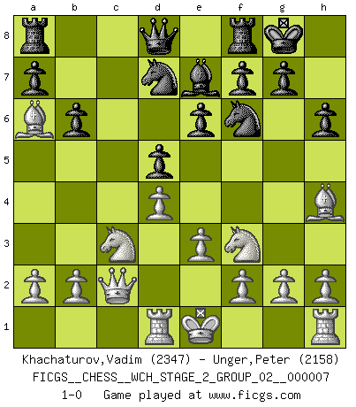 Last move : 1-0 2010 July 8 0:12:51 [Event "FICGS__CHESS__WCH_STAGE_2_GROUP_02__000007"] [Site "FICGS"] [Date "2010.07.06"] [Round "1"] [White "Khachaturov,Vadim"] [Black "Unger,Peter"] [Result "1-0"] [WhiteElo "2347"] [BlackElo "2158"] 1.d4 d5 2.c4 c6 3.Nf3 Nf6 4.Nc3 e6 5.Bg5 h6 6.Bh4 Be7 7.e3 O-O 8.Qc2 Nbd7 9.Rd1 b6 10.Bd3 Ba6 11.cxd5 cxd5 12.Bxa6 1-0 QGD Slav : 4.Nc3 Kingside Castling by player Black (move 7) Player White won this chess game. Follow this game move after move (download)A man without frontiers. He didn't divide the East and the West, he brought them together in their admiration for him. (Ljubomir Ljubojevic, about Bobby Fischer's death) Warum muß ich gegen diesen IDIOTEN verlieren? (Aaron Nimzowitsch) El Ajedrez es un expediente tonto que hace creer a la gente inactiva que hacen una cosa muy astuta cuando solamente estan perdiendo su tiempo. (George Bernard Shaw) Nous sommes les pions de la mystérieuse partie d'Echecs jouée par Dieu. Il nous déplace, nous arrête, nous pousse encore, puis nous lance un à un dans la boîte du Néant. Epitaphe sur la tombe de David Janowsky (1868-1927). The bottom line is always the bottom line. (Johann Piek)
