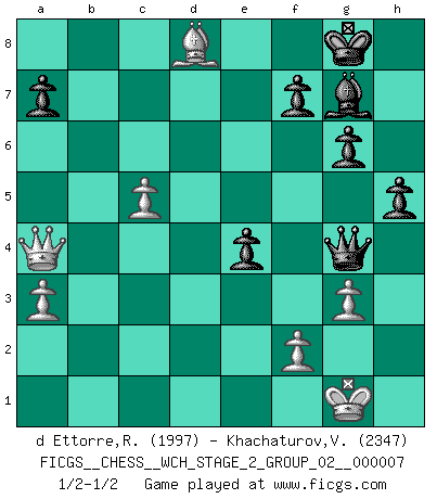 Last move : 1/2-1/2 2010 October 16 5:48:6 [Event "FICGS__CHESS__WCH_STAGE_2_GROUP_02__000007"] [Site "FICGS"] [Date "2010.07.06"] [Round "1"] [White "d Ettorre,Rodolfo"] [Black "Khachaturov,Vadim"] [Result "1/2-1/2"] [WhiteElo "1997"] [BlackElo "2347"] 1.Nf3 Nf6 2.c4 g6 3.Nc3 Bg7 4.d4 O-O 5.e4 d6 6.Be2 e5 7.O-O Nbd7 8.dxe5 dxe5 9.Be3 c6 10.Qc2 Qc7 11.Rfd1 Re8 12.h3 Bf8 13.Rd2 Nc5 14.Rad1 Ne6 15.a3 b6 16.b4 Bb7 17.g3 Rad8 18.Rxd8 Rxd8 19.Rxd8 Nxd8 20.c5 bxc5 21.bxc5 Bc8 22.Kg2 Qd7 23.Nxe5 Qxh3+ 24.Kg1 Qe6 25.Bd4 Nd7 26.Bg4 Qe7 27.Bxd7 Bxd7 28.Qa4 Ne6 29.Nxd7 Qxd7 30.Nd5 Bg7 31.Be3 Nd8 32.Bf4 h5 33.Bd6 Qg4 34.Be7 cxd5 35.Bxd8 dxe4 1/2-1/2 Reti Opening Kingside Castling by player Black (move 4) Kingside Castling by player White (move 7) This chess game ended in a draw. Follow this game move after move (download)You can only get good at Chess if you love the game. (Bobby Fischer) Ich kenne Menschen, die allen Willen der Welt besitzen und doch nicht Schach spielen können. (Robert James Fischer) ¿Esta Bobby Fischer algo cuerdo?. (Salo Flohr) Comme les marins qui ont mille raisons différentes d'aller en mer, les joueurs d'échecs en ont tout autant avant de s'installer devant une table et jouer... (Vincent Bertignac, philosophe) Good decisions come from experience, and experience comes from bad decisions. (Anonymous)