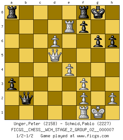 Last move : 1/2-1/2 2010 August 29 18:39:23 [Event "FICGS__CHESS__WCH_STAGE_2_GROUP_02__000007"] [Site "FICGS"] [Date "2010.07.06"] [Round "1"] [White "Unger,Peter"] [Black "Schmid,Pablo"] [Result "1/2-1/2"] [WhiteElo "2158"] [BlackElo "2227"] 1.d4 Nf6 2.Nf3 g6 3.c4 Bg7 4.Nc3 d5 5.cxd5 Nxd5 6.e4 Nxc3 7.bxc3 c5 8.Rb1 O-O 9.Be2 cxd4 10.cxd4 Qa5+ 11.Bd2 Qxa2 12.O-O Bg4 13.Bg5 h6 14.Be3 Nc6 15.d5 Bxf3 16.Bxf3 Ne5 17.Rxb7 a5 18.Rxe7 a4 19.Bd4 Nxf3+ 20.gxf3 Bxd4 21.Qxd4 a3 22.d6 Qb2 23.Qd5 1/2-1/2 King's Indian : East Indian defense Kingside Castling by player Black (move 8) Kingside Castling by player White (move 12) This chess game ended in a draw. Follow this game move after move (download)Chess is a beautiful mistress. (Bent Larsen) Ein bischen Romantik kann weder im Schach noch in der Liebe schaden. Also versuche ich mich ab und zu daran zu erinnern. (Nigel Short) Alekhine es un poeta que crea un trabajo de arte de algo que raramente inspiraría a otra persona a mandar una tarjeta postal. (Max Euwe) Mon pion favori sur ma case favorite ! Bronstein en parlant d'un coup de pion en h5 quand il avait les Noirs. In my experience, there's no such thing as luck. (Obi-Wan Kenobi in Star Wars ep.4)