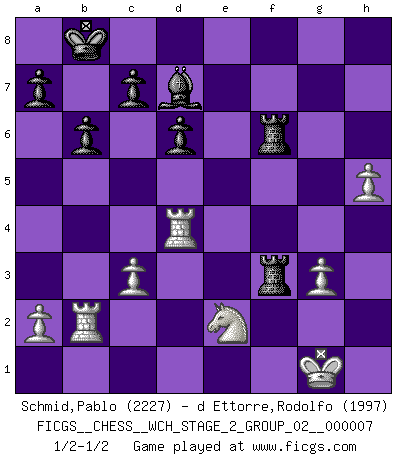 Last move : 1/2-1/2 2010 November 21 8:15:3 [Event "FICGS__CHESS__WCH_STAGE_2_GROUP_02__000007"] [Site "FICGS"] [Date "2010.07.06"] [Round "1"] [White "Schmid,Pablo"] [Black "d Ettorre,Rodolfo"] [Result "1/2-1/2"] [WhiteElo "2227"] [BlackElo "1997"] 1.e4 e5 2.Nf3 Nc6 3.Bc4 Bc5 4.b4 Bxb4 5.c3 Be7 6.d4 Na5 7.Be2 exd4 8.Qxd4 d6 9.Qxg7 Bf6 10.Qg3 Qe7 11.Qf4 Bd7 12.O-O O-O-O 13.Qe3 Nc6 14.Nbd2 Qf8 15.Nb3 Nge7 16.Nbd4 Rg8 17.Rb1 Qg7 18.g3 h5 19.h4 Kb8 20.Rd1 Rde8 21.Qd3 Qg6 22.Bg5 Bxg5 23.Nxg5 b6 24.Rb2 f6 25.Nge6 Nxd4 26.Nxd4 f5 27.e5 f4 28.Qxg6 Nxg6 29.Bxh5 Rxe5 30.Bxg6 Rxg6 31.Ne2 Rf5 32.Rd4 fxg3 33.fxg3 Rf3 34.h5 Rgf6 35.Rb1 Re3 36.Rb2 Ref3 37.Rb1 Re3 38.Rb2 Ref3 1/2-1/2 Evans gambit : Cordel variation Kingside Castling by player White (move 12) Queenside Castling by player Black (move 12) This chess game ended in a draw. Follow this game move after move (download)Suddenly it was obvious to me in my analysis I had missed what Fischer had found with the greatest of ease at the board. (Mikhail Botvinnik) Die unerbitterlichsten Regeln im Schach sind die Ausnahmen. (Savielly Grigorievitsch Tartakower) Preferería tener un Peón que un dedo. (Reuben Fine) Le jeu d'échecs est comme rejeté hors du temps. (Antoine de Saint-Exupéry) Better than a thousand days of diligent study is one day with a great teacher. (Japanese proverb)
