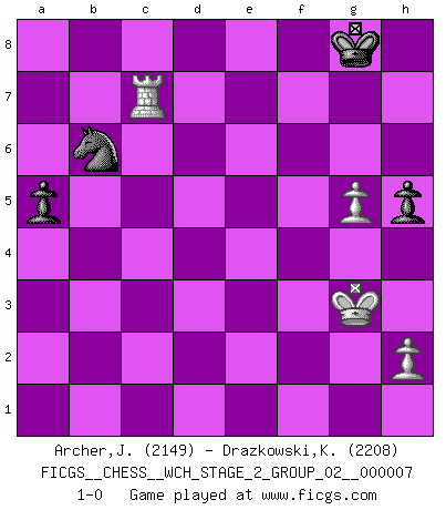 Last move : 1-0 2011 January 14 20:49:32 [Event "FICGS__CHESS__WCH_STAGE_2_GROUP_02__000007"] [Site "FICGS"] [Date "2010.07.06"] [Round "1"] [White "Archer,J. Robert"] [Black "Drazkowski,Krzysztof"] [Result "1-0"] [WhiteElo "2149"] [BlackElo "2208"] 1.d4 Nf6 2.c4 e6 3.Nf3 b6 4.g3 Ba6 5.b3 Bb4+ 6.Bd2 Be7 7.Bg2 c6 8.Bc3 O-O 9.Nbd2 d5 10.Ne5 Nfd7 11.Nd3 Qc7 12.e4 dxc4 13.Nxc4 c5 14.d5 exd5 15.exd5 Bxc4 16.bxc4 Qd6 17.O-O Bf6 18.Qb3 Bxc3 19.Qxc3 Nf6 20.Rfe1 Nbd7 21.f4 Rae8 22.Ne5 Nb8 23.Bf3 Re7 24.a4 a5 25.Qb2 Rfe8 26.Rab1 Nbd7 27.Re2 h6 28.Rbe1 Kf8 29.Bg2 Nb8 30.Bh3 Na6 31.Bf5 Kg8 32.g4 Nc7 33.Qc2 g5 34.Qd2 gxf4 35.Qxf4 Nfxd5 36.cxd5 Nxd5 37.Qg3 f6 38.Bg6 fxe5 39.Bxe8 Rxe8 40.Rxe5 Rxe5 41.Rxe5 Qd7 42.g5 h5 43.Qd3 Qg4+ 44.Kh1 Qg2+ 45.Kxg2 Nf4+ 46.Kg3 Nxd3 47.Re6 c4 48.Rxb6 Nc5 49.Rc6 Nxa4 50.Rxc4 Nb6 51.Rc7 1-0 Queen's Indian : Nimzovich variation (exaggerated Fianchetto) Kingside Castling by player Black (move 8) Kingside Castling by player White (move 17) 10 pieces endgame at move 48 : White KRPPP , Black KNPPP WHITE : King + 1 Rook 3 Pawns BLACK : King + 1 Knight 3 Pawns 9 pieces endgame at move 49 : White KRPP , Black KNPPP WHITE : King + 1 Rook 2 Pawns BLACK : King + 1 Knight 3 Pawns 8 pieces endgame at move 50 : White KRPP , Black KNPP WHITE : King + 1 Rook 2 Pawns BLACK : King + 1 Knight 2 Pawns Player White won this chess game. Follow this game move after move (download)It's just you and your opponent at the board and you're trying to prove something. (Bobby Fischer) Ich liebe den Moment, wenn ich das Ego meines Gegenüber breche. (Robert James Fischer) El Ajedrez es una guerra en un tablero. El objetivo es aplastar la mente del oponente. (Bobby Fischer) Il s'avisa de me proposer d'apprendre les échecs qu'il jouait un peu... me voilà forcené des échecs. J'achète un échiquier, je m'enferme dans ma chambre, j'y passe des jours et des nuits à vouloir apprendre par cur toutes les parties. (Jean-Jacques Rousseau, Confessions) I fear not the man who has practiced 10,000 kicks once, but I fear the man who has practiced one kick 10,000 times. (Bruce Lee)