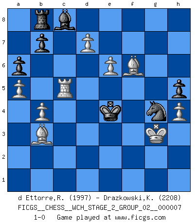 Last move : 1-0 2011 January 9 15:45:12 [Event "FICGS__CHESS__WCH_STAGE_2_GROUP_02__000007"] [Site "FICGS"] [Date "2010.07.06"] [Round "1"] [White "d Ettorre,Rodolfo"] [Black "Drazkowski,Krzysztof"] [Result "1-0"] [WhiteElo "1997"] [BlackElo "2208"] 1.Nf3 d5 2.c4 e6 3.g3 Nf6 4.d4 Be7 5.Bg2 O-O 6.O-O Nbd7 7.Qc2 a6 8.Nbd2 c5 9.Rd1 cxd4 10.Nxd4 Qb6 11.N2f3 e5 12.Nf5 Bc5 13.cxd5 Bxf2+ 14.Kh1 Bc5 15.h3 g6 16.Nh6+ Kg7 17.Ng5 Nh5 18.Rd3 Bf2 19.Rf3 Nxg3+ 20.Kh2 Nh5 21.Nhxf7 Bg3+ 22.Rxg3 Nxg3 23.Kxg3 Rxf7 24.Nxf7 Kxf7 25.Bg5 Kg7 26.Rf1 Qd6 27.e4 Kg8 28.Qf2 Qf8 29.Qxf8+ Nxf8 30.Rc1 Nd7 31.Rc7 Kf8 32.h4 Ke8 33.Bh3 Rb8 34.Be6 h5 35.d6 Ra8 36.b4 Rb8 37.a4 Ra8 38.Bd5 Rb8 39.a5 Ra8 40.Bb3 Rb8 41.Ba4 Ra8 42.Bf6 Kf7 43.Bxe5 Ke6 44.Bf4 Rb8 45.Bb3+ Kf6 46.e5+ Kf5 47.e6 g5 48.Bxg5 Ne5 49.Rc5 Ke4 50.Bf6 Ng4 51.d7 1-0 Reti Opening Kingside Castling by player Black (move 5) Kingside Castling by player White (move 6) Player White won this chess game. Follow this game move after move (download)Best by test: 1. e4 (Bobby Fischer) Fischer machte Schach einfach zu einer aufregenden Sache, wann immer er sich ans Brett setzte. (Raymond Keene) Todo se encuentra en un estado de flujo y esto incluye al mundo del Ajedrez. (Mikhail Botvinnik) Les Echecs sont affaire de jugement sensible. Savoir quand frapper et quand esquiver. (Fischer) All the troubles of the world come from being unable to sit alone in a quiet room. (Blaise Pascal)