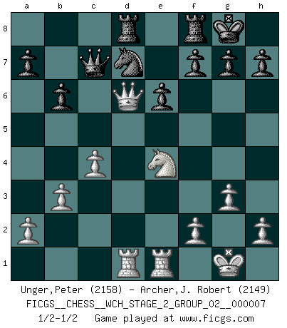 Last move : 1/2-1/2 2010 August 18 18:41:51 [Event "FICGS__CHESS__WCH_STAGE_2_GROUP_02__000007"] [Site "FICGS"] [Date "2010.07.06"] [Round "1"] [White "Unger,Peter"] [Black "Archer,J. Robert"] [Result "1/2-1/2"] [WhiteElo "2158"] [BlackElo "2149"] 1.d4 Nf6 2.Nf3 e6 3.c4 b6 4.g3 Ba6 5.b3 Bb4+ 6.Bd2 Be7 7.Bg2 c6 8.Bc3 d5 9.Nbd2 Nbd7 10.O-O O-O 11.Re1 c5 12.e4 dxe4 13.Nxe4 Bb7 14.Nfg5 cxd4 15.Bxd4 Qc7 16.Nxf6+ Bxf6 17.Bxb7 Qxb7 18.Ne4 Bxd4 19.Qxd4 Rad8 20.Rad1 Qc7 21.Qd6 1/2-1/2 Queen's pawn game Kingside Castling by player White (move 10) Kingside Castling by player Black (move 10) This chess game ended in a draw. Follow this game move after move (download)Chess is the art of analysis. (Mikhail Botvinnik) Frage des Reporters: -Welche besonderen Umstände rechtfertigen das Anhalten der Uhren während einer Turnierpartie? Antwort: -Einen Fotographen zu strangulieren. (Siegbert Tarrasch) Un Peón pasado aumenta su poder a medida de que el número de piezas en el tablero disminuye. (Capablanca) Karpov est une pièce de musée. (Garry Kasparov) The greatest con, that he ever pulled... was making you believe... that he is you. (Revolver, movie)