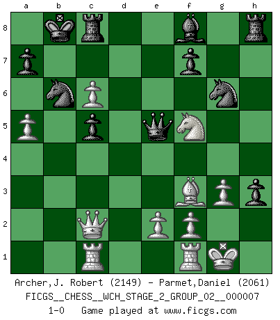 Last move : 1-0 2010 October 18 18:59:55 [Event "FICGS__CHESS__WCH_STAGE_2_GROUP_02__000007"] [Site "FICGS"] [Date "2010.07.06"] [Round "1"] [White "Archer,J. Robert"] [Black "Parmet,Daniel"] [Result "1-0"] [WhiteElo "2149"] [BlackElo "2061"] 1.d4 d5 2.c4 c6 3.Nf3 Nf6 4.Nc3 dxc4 5.a4 Bf5 6.Ne5 Nbd7 7.Nxc4 Qc7 8.g3 e5 9.dxe5 Nxe5 10.Bf4 Nfd7 11.Bg2 g5 12.Ne3 gxf4 13.Nxf5 O-O-O 14.Qc2 Ng6 15.O-O fxg3 16.hxg3 h5 17.Rac1 Kb8 18.b4 h4 19.Nb5 Qe5 20.Nbd4 Rc8 21.b5 c5 22.Nc6+ bxc6 23.bxc6 Nb6 24.a5 h3 25.Bf3 1-0 QGD Slav : Krause attack Queenside Castling by player Black (move 13) Kingside Castling by player White (move 15) Player White won this chess game. Follow this game move after move (download)Chess is above all, a fight ! (Emanuel Lasker) Das Schach ist nichts für kleine Geister, es beansprucht einen vollen Mann, der sich nicht sklavisch an das Überlieferte hält, sondern selbständig die Tiefen des Spiels zu ergründen sucht. (Wilhelm Steinitz) La batalla por la última verdad nunca sera ganada. Y es por eso que el Ajedrez es tan fascinante. (Hans Kmoch) Les Echecs ont trois composantes : le temps, l'espace et le matériel en dernier. (Mikhail Tal) Crush them ! Make them suffer ! (General Grievous in Star Wars ep.3)