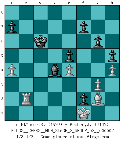 Last move : 1/2-1/2 2010 December 16 2:13:14 [Event "FICGS__CHESS__WCH_STAGE_2_GROUP_02__000007"] [Site "FICGS"] [Date "2010.07.06"] [Round "1"] [White "d Ettorre,Rodolfo"] [Black "Archer,J. Robert"] [Result "1/2-1/2"] [WhiteElo "1997"] [BlackElo "2149"] 1.Nf3 Nf6 2.g3 d5 3.Bg2 c6 4.O-O Bg4 5.b3 Nbd7 6.Bb2 e6 7.c4 Be7 8.d4 O-O 9.Nc3 h6 10.Re1 Qa5 11.e4 dxc4 12.bxc4 e5 13.d5 Nb6 14.Qb3 Nfd7 15.Nd2 Bg5 16.Nf1 Nc5 17.Qa3 Nxc4 18.Qxa5 Nxa5 19.Ba3 b6 20.h4 Bd8 21.Ne3 Bd7 22.Bxc5 bxc5 23.Na4 Bb6 24.Rec1 cxd5 25.Nxc5 d4 26.Nxd7 dxe3 27.Nxf8 exf2+ 28.Kf1 Kxf8 29.Rab1 g6 30.Ke2 Rd8 31.Rd1 Rc8 32.Rbc1 Rxc1 33.Rxc1 h5 34.Kf1 Nb7 35.Rd1 Ke7 36.Rc1 Nd6 37.a4 Bd4 38.Rc7+ Kd8 39.Rc1 Nb7 40.Rb1 Kc7 41.Rb4 Nc5 42.Bf3 Kc6 43.Bg2 Nd3 44.Rb8 Nb2 45.Rxb2 1/2-1/2 Reti Opening Kingside Castling by player White (move 4) Kingside Castling by player Black (move 8) This chess game ended in a draw. Follow this game move after move (download)The Pawns are the soul of the game. (Francois Andre Danican Philidor) Lisa Lane, amerikanische Schachmeisterin, hatte Fischer einmal als stärksten lebenden Spieler bezeichnet. Antwort: Das ist richtig, aber Lisa Lane ist eigentlich nicht in der Lage, das zu beurteilen. (Robert James Fischer) Repentinamente, me resultaba obvio en mi analisis que yo había pasado por alto lo que Fischer había visto en el tablero con la mas grande facilidad. (Mikhail Botvinnik) Il (Jacob Murray) ne joue pas pour le bon coup, mais pour le meilleur. (Eloi Relange) The intuitive mind is a sacred gift; the rational mind is a faithful servant. We have created a society that honors the servant but has forgotten the gift. (Albert Einstein)